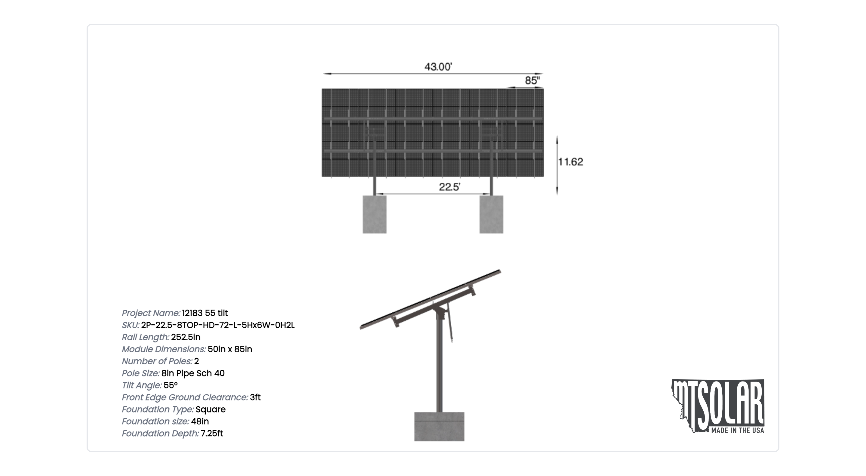 This Pole Mount is designed to meet your site-specific inputs which are modules with dimensions of 85 inches by 50 inches and an array layout of 6 wide by 5 high.