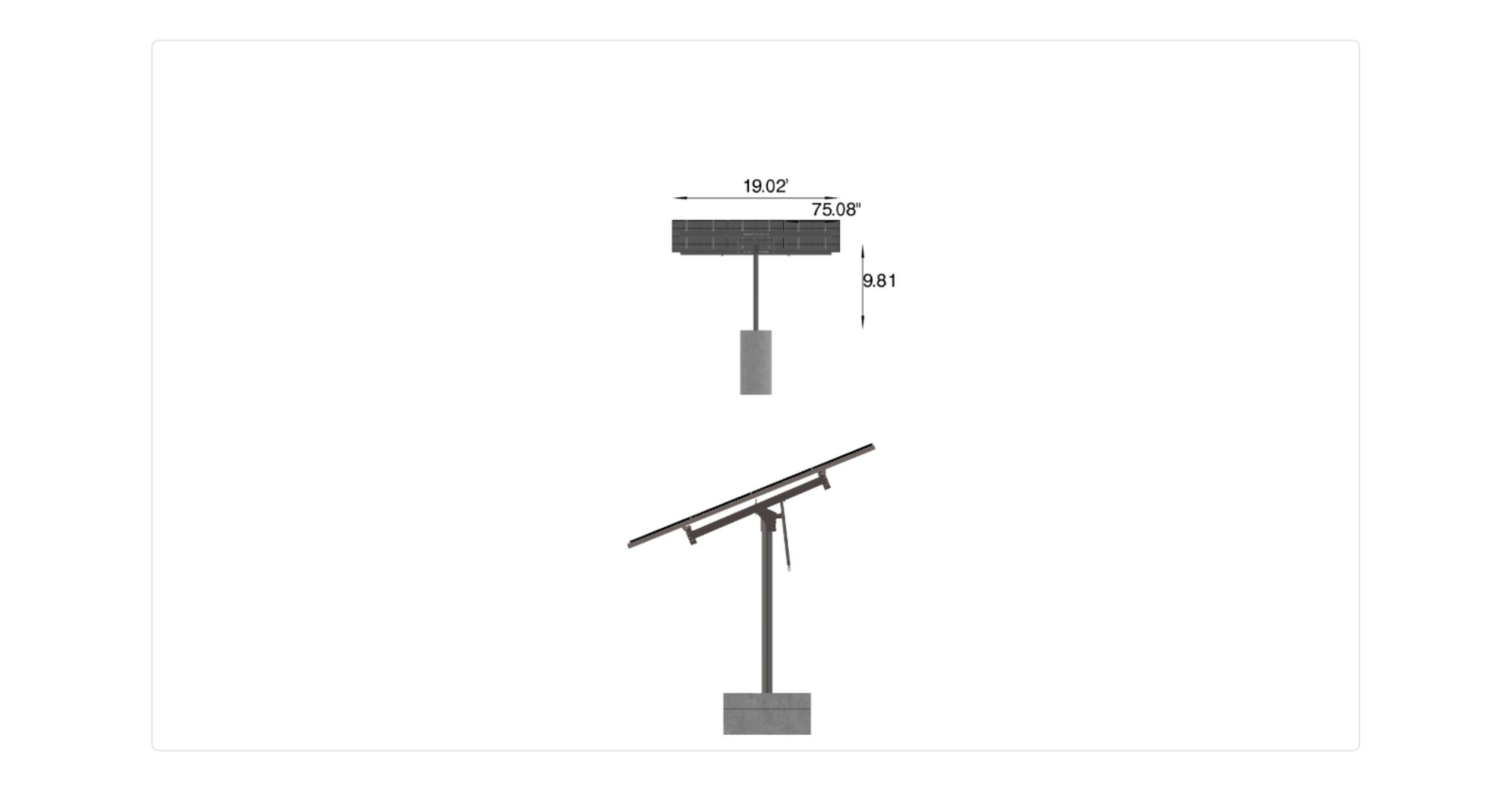 This Pole Mount is designed to meet your site-specific inputs which are modules with dimensions of 75.08 inches by 41.5 inches and an array layout of 3 wide by 4 high.