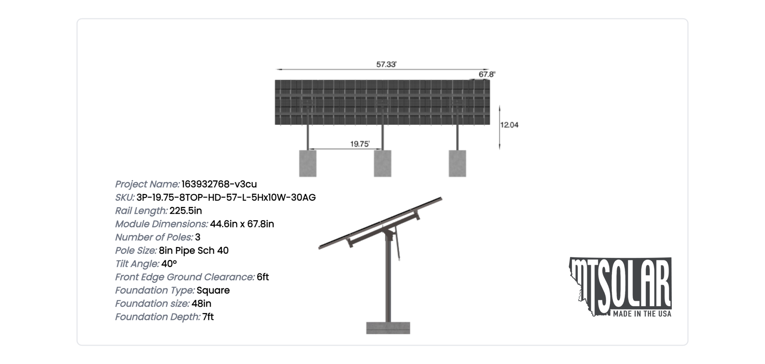 This Pole Mount is designed to meet your site-specific inputs which are modules with dimensions of 67.8 inches by 44.6 inches and an array layout of 10 wide by 5 high.