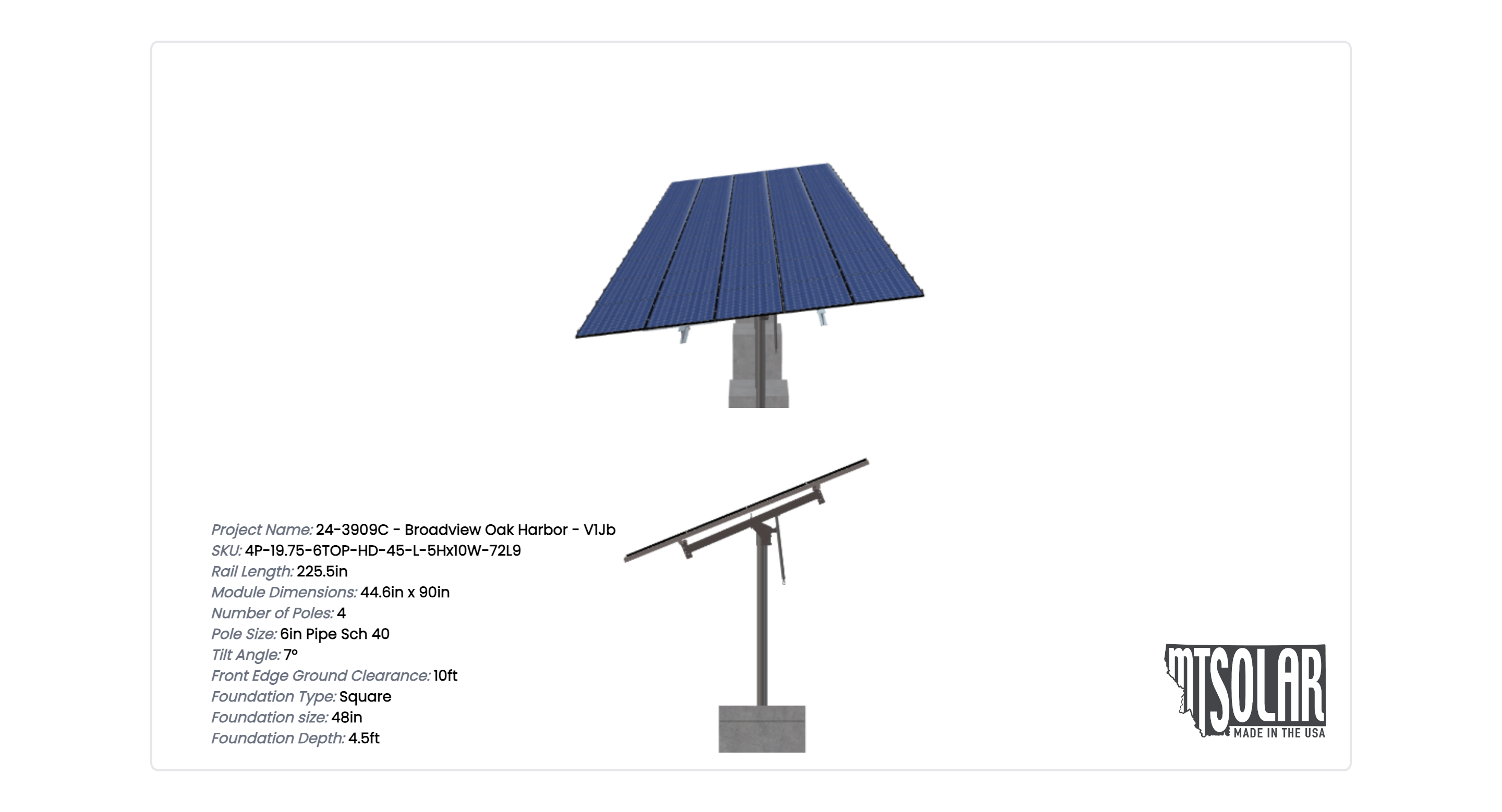 This Pole Mount is designed to meet your site-specific inputs which are modules with dimensions of 90 inches by 44.6 inches and an array layout of 10 wide by 5 high.