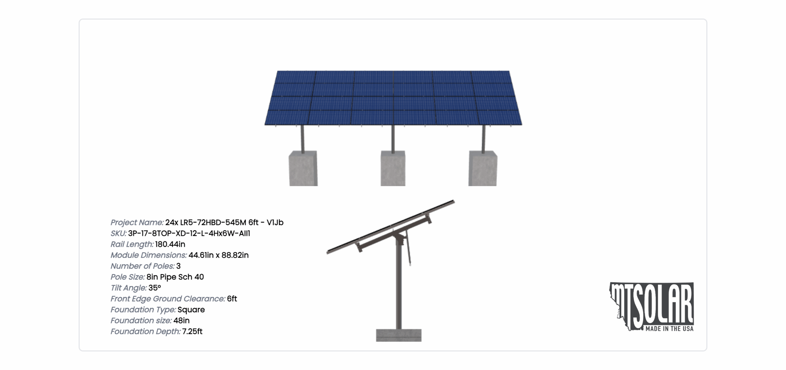 This Pole Mount is designed to meet your site-specific inputs which are modules with dimensions of 88.82 inches by 44.61 inches and an array layout of 6 wide by 4 high.