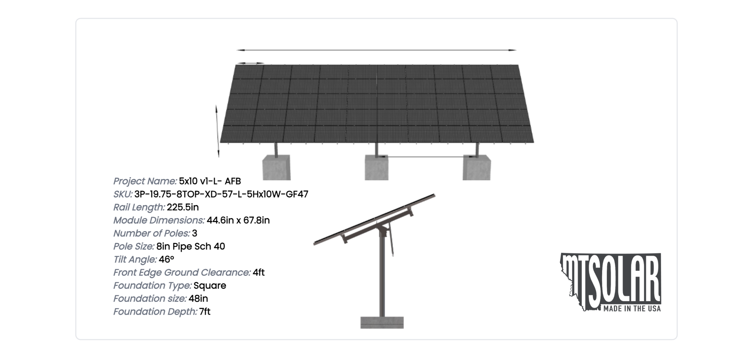 This Pole Mount is designed to meet your site-specific inputs which are modules with dimensions of 67.8 inches by 44.6 inches and an array layout of 10 wide by 5 high.