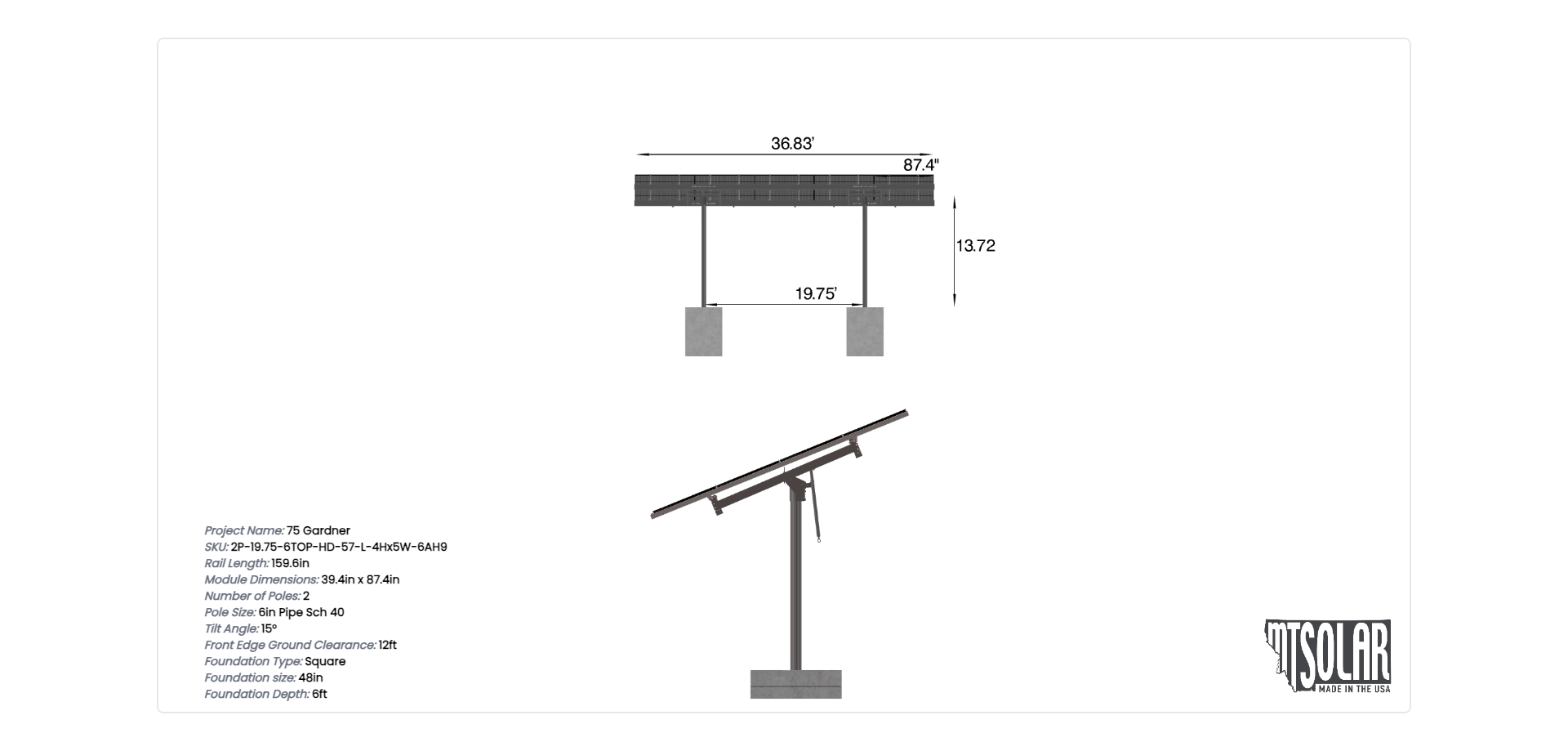 This Pole Mount is designed to meet your site-specific inputs which are modules with dimensions of 87.4 inches by 39.4 inches and an array layout of 5 wide by 4 high.