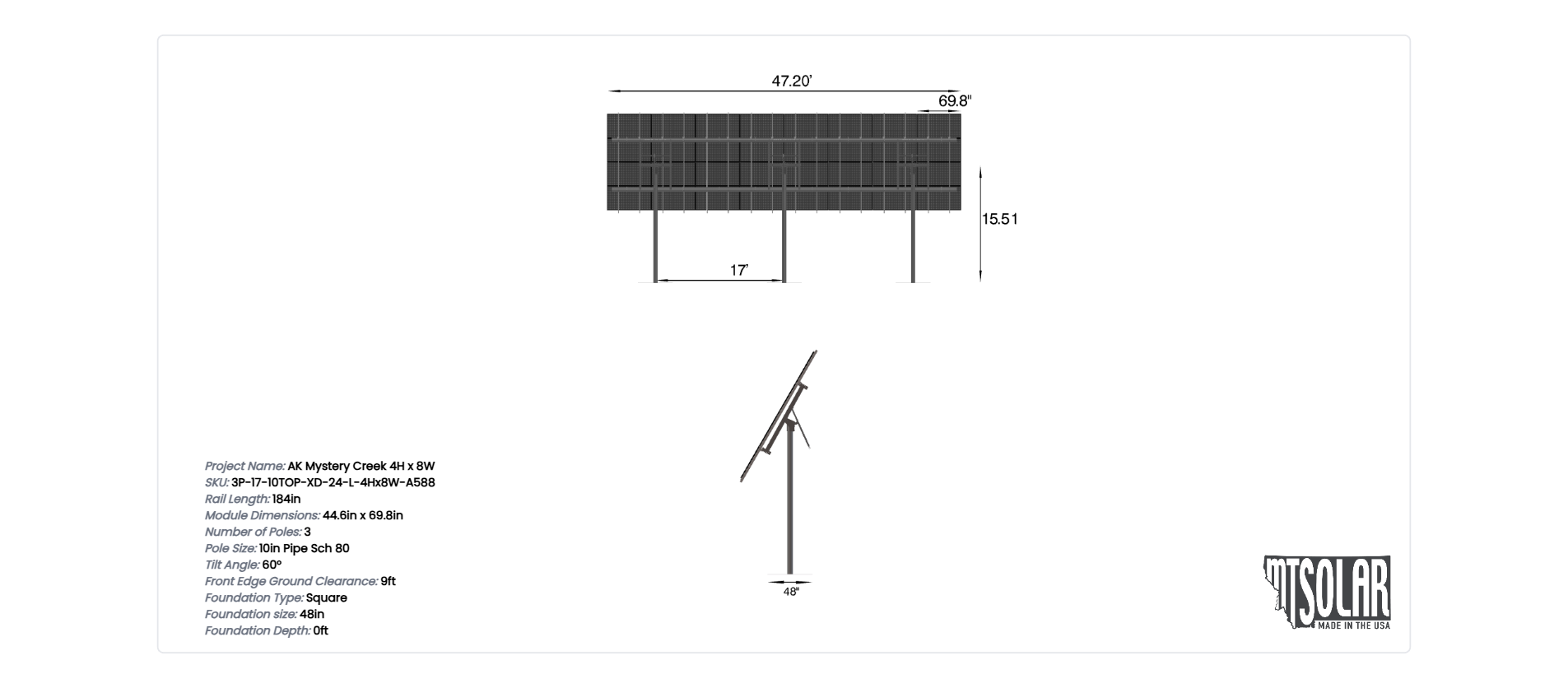 This Pole Mount is designed to meet your site-specific inputs which are modules with dimensions of 69.8 inches by 44.6 inches and an array layout of 8 wide by 4 high.