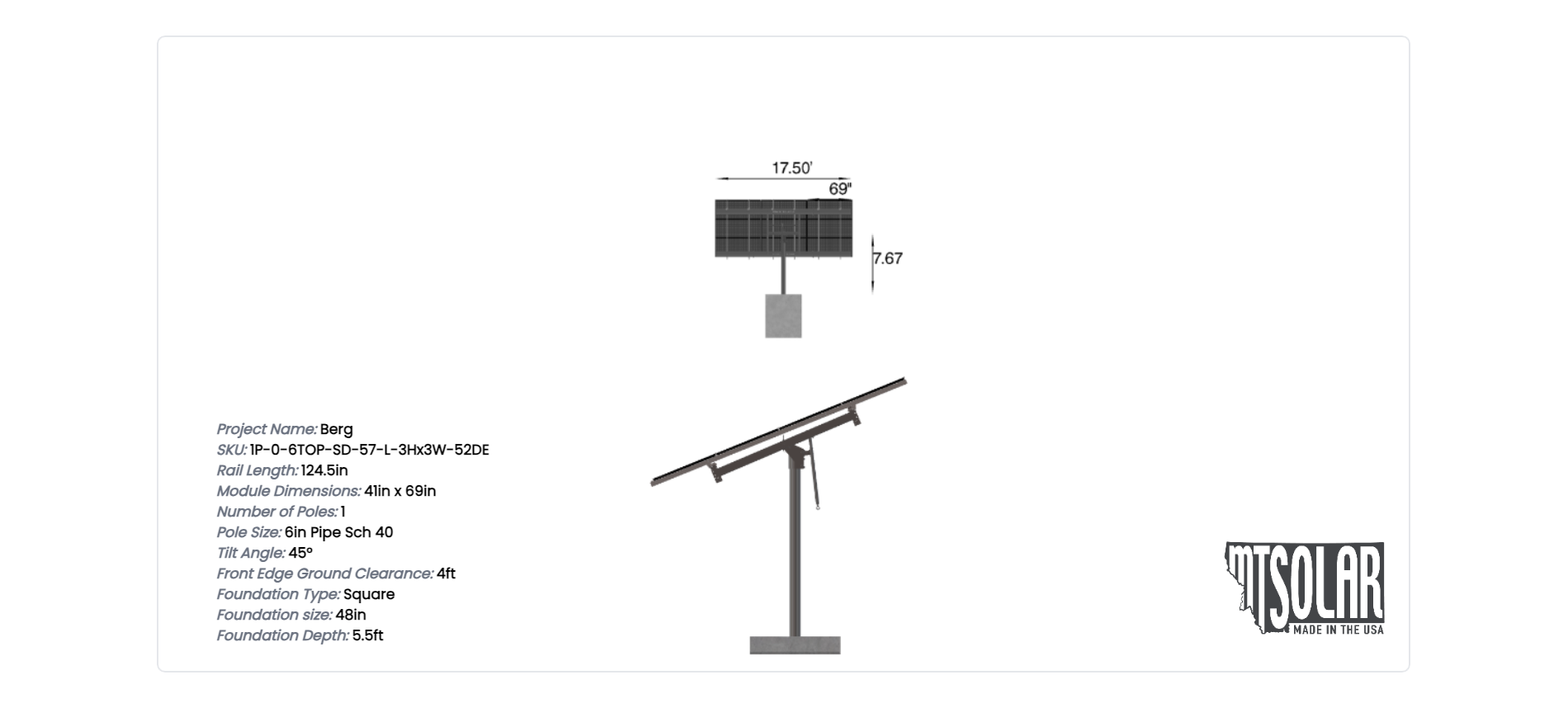 This Pole Mount is designed to meet your site-specific inputs which are modules with dimensions of 69 inches by 41 inches and an array layout of 3 wide by 3 high.