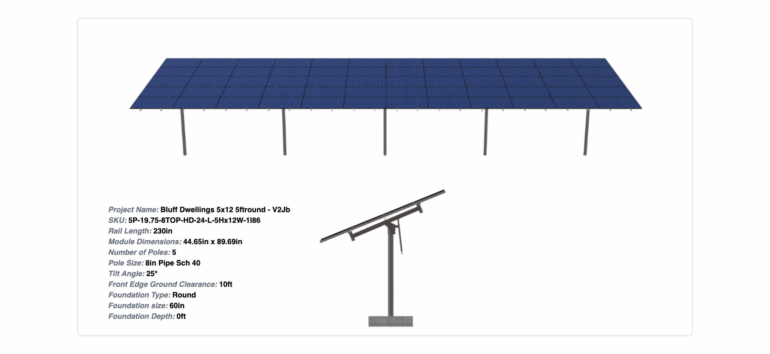 This Pole Mount is designed to meet your site-specific inputs which are modules with dimensions of 89.69 inches by 44.65 inches and an array layout of 12 wide by 5 high.