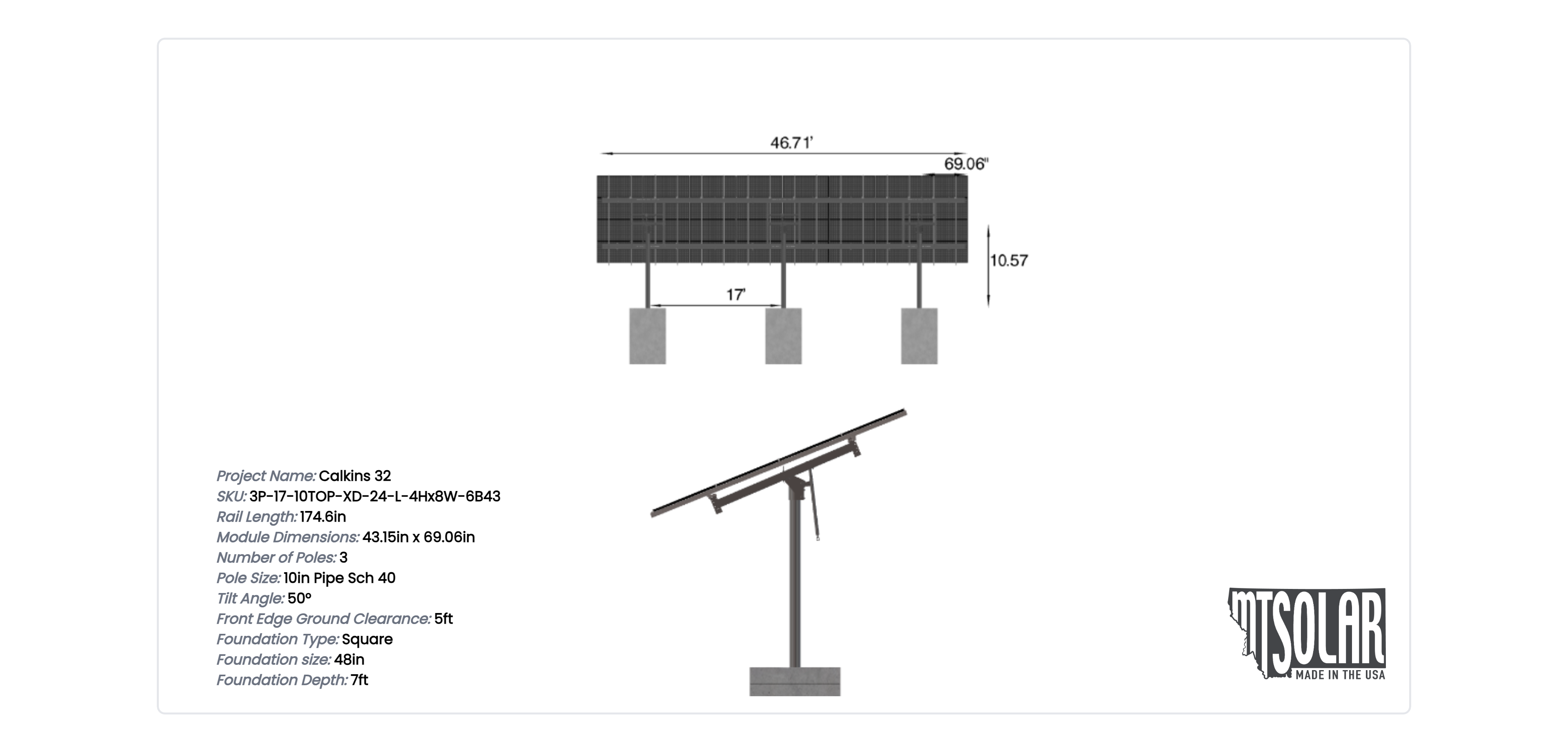 This Pole Mount is designed to meet your site-specific inputs which are modules with dimensions of 69.06 inches by 43.15 inches and an array layout of 8 wide by 4 high.