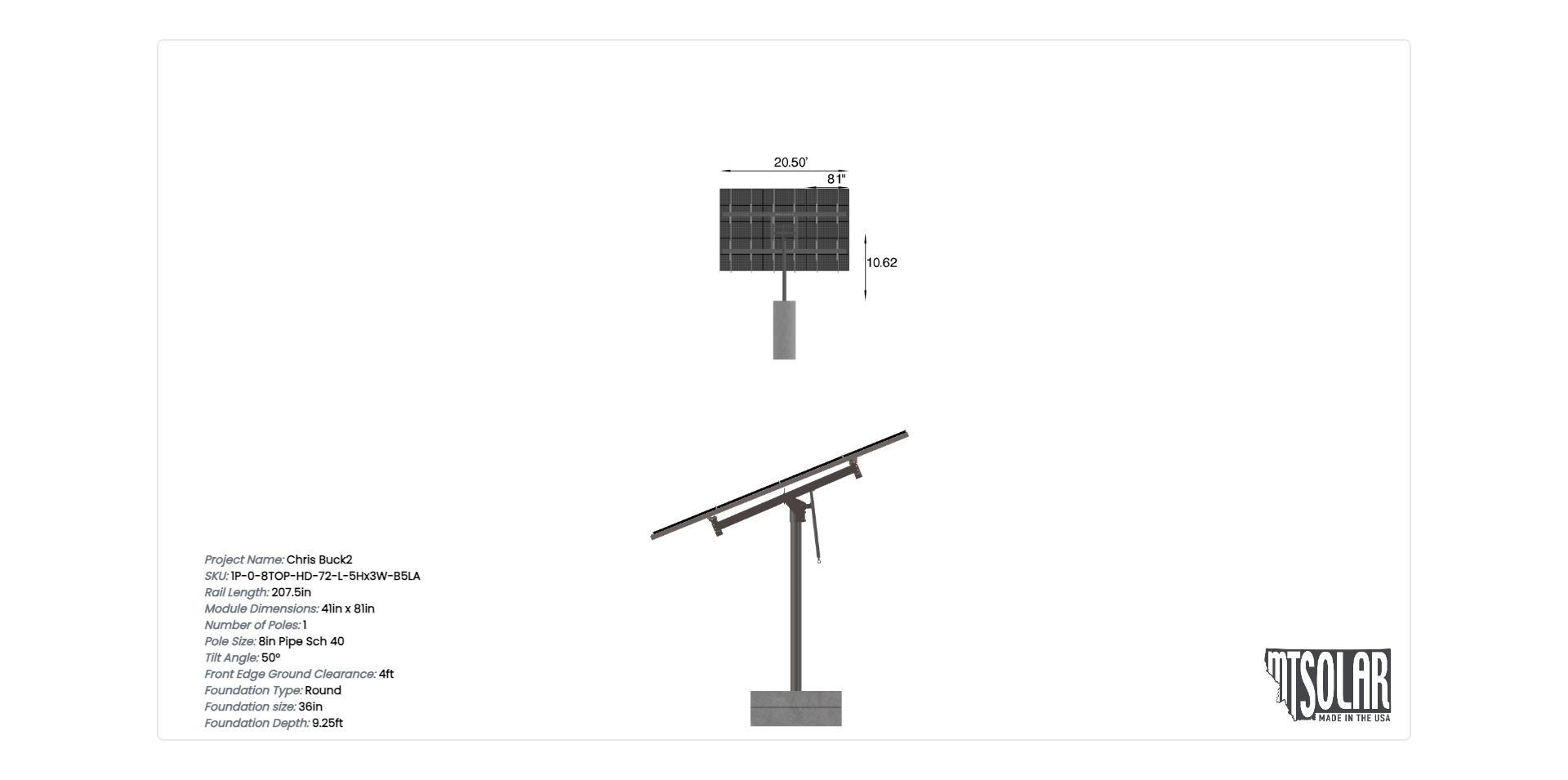 This Pole Mount is designed to meet your site-specific inputs which are modules with dimensions of 81 inches by 41 inches and an array layout of 3 wide by 5 high.