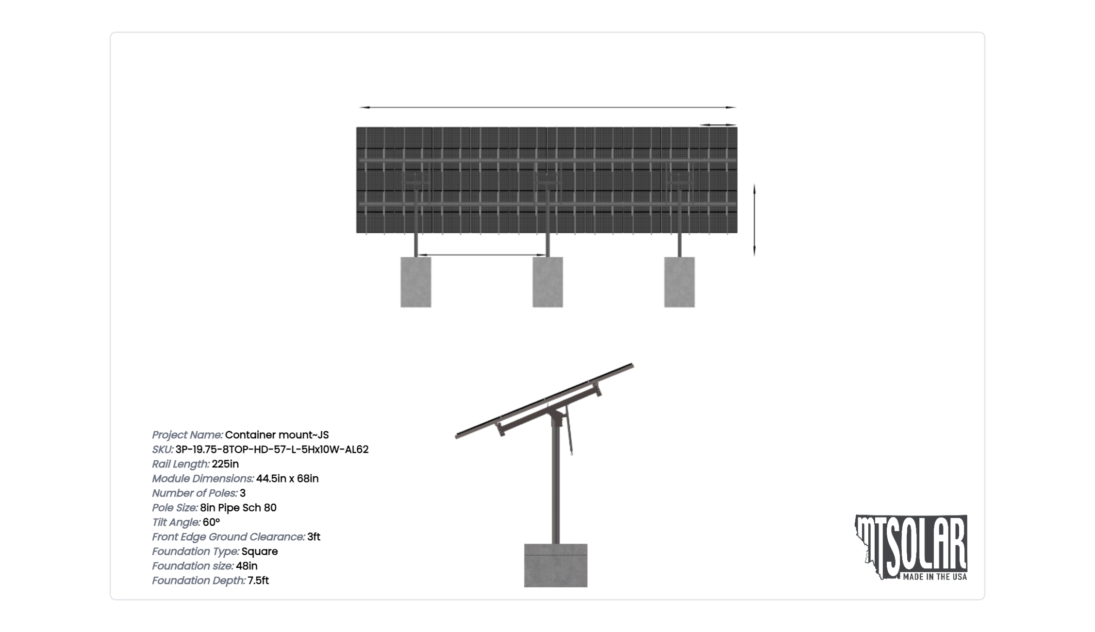 This Pole Mount is designed to meet your site-specific inputs which are modules with dimensions of 68 inches by 44.5 inches and an array layout of 10 wide by 5 high.
