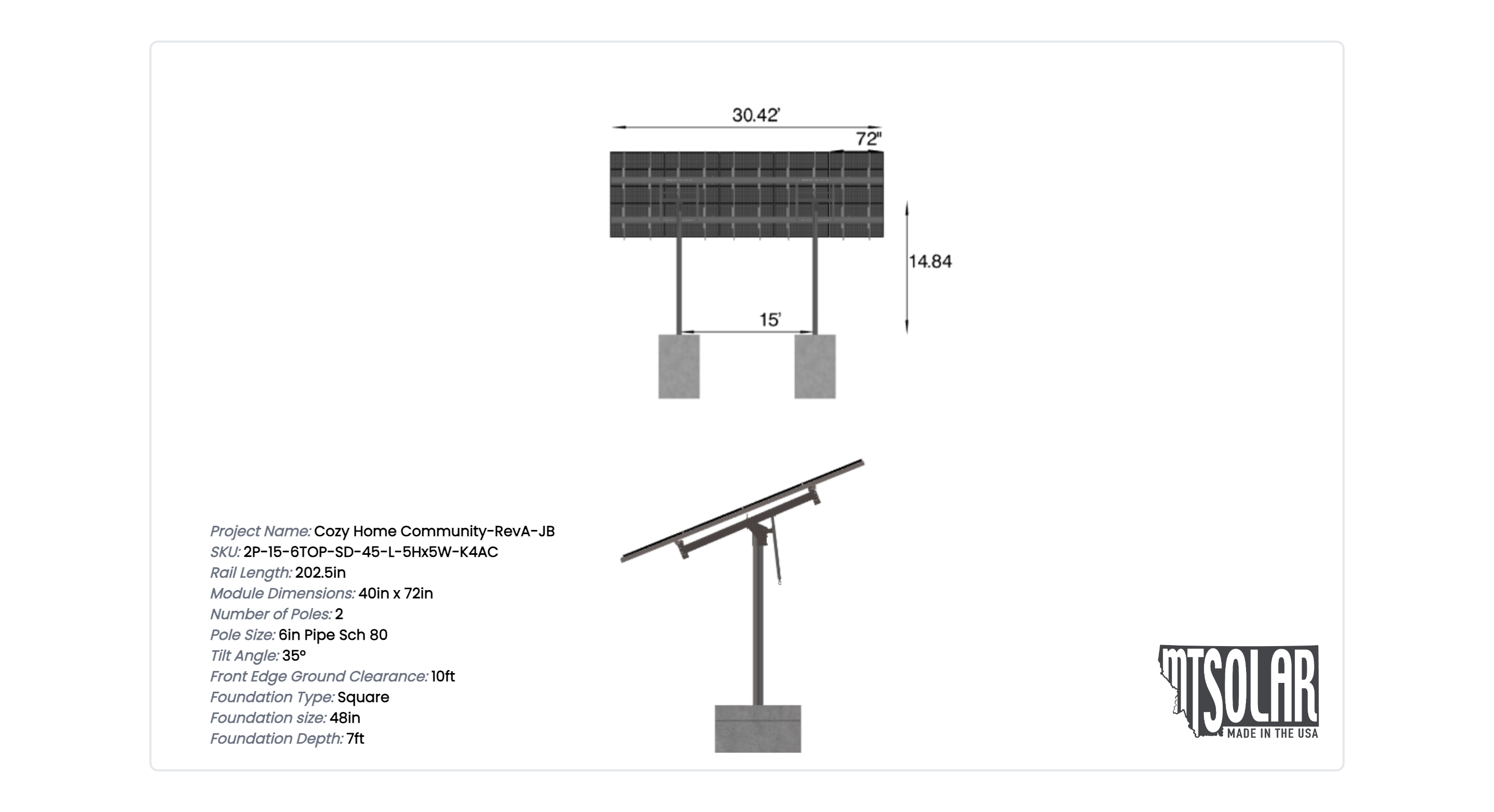 This Pole Mount is designed to meet your site-specific inputs which are modules with dimensions of 72 inches by 40 inches and an array layout of 5 wide by 5 high.