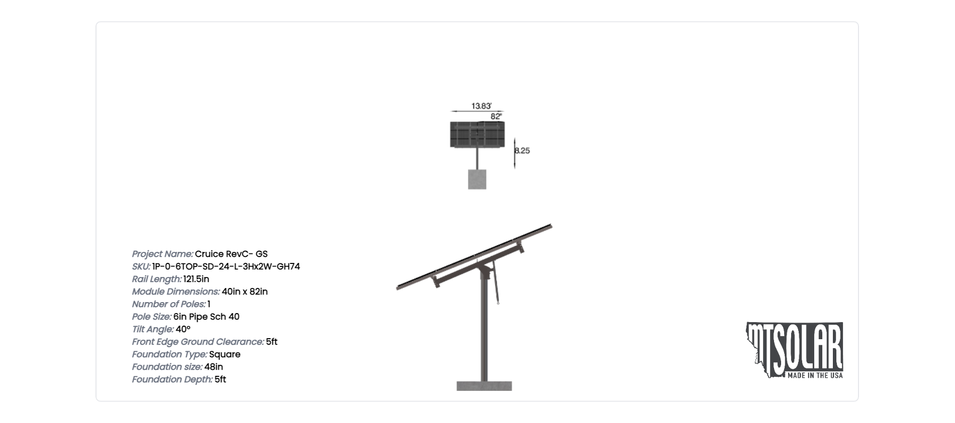 This Pole Mount is designed to meet your site-specific inputs which are modules with dimensions of 82 inches by 40 inches and an array layout of 2 wide by 3 high.