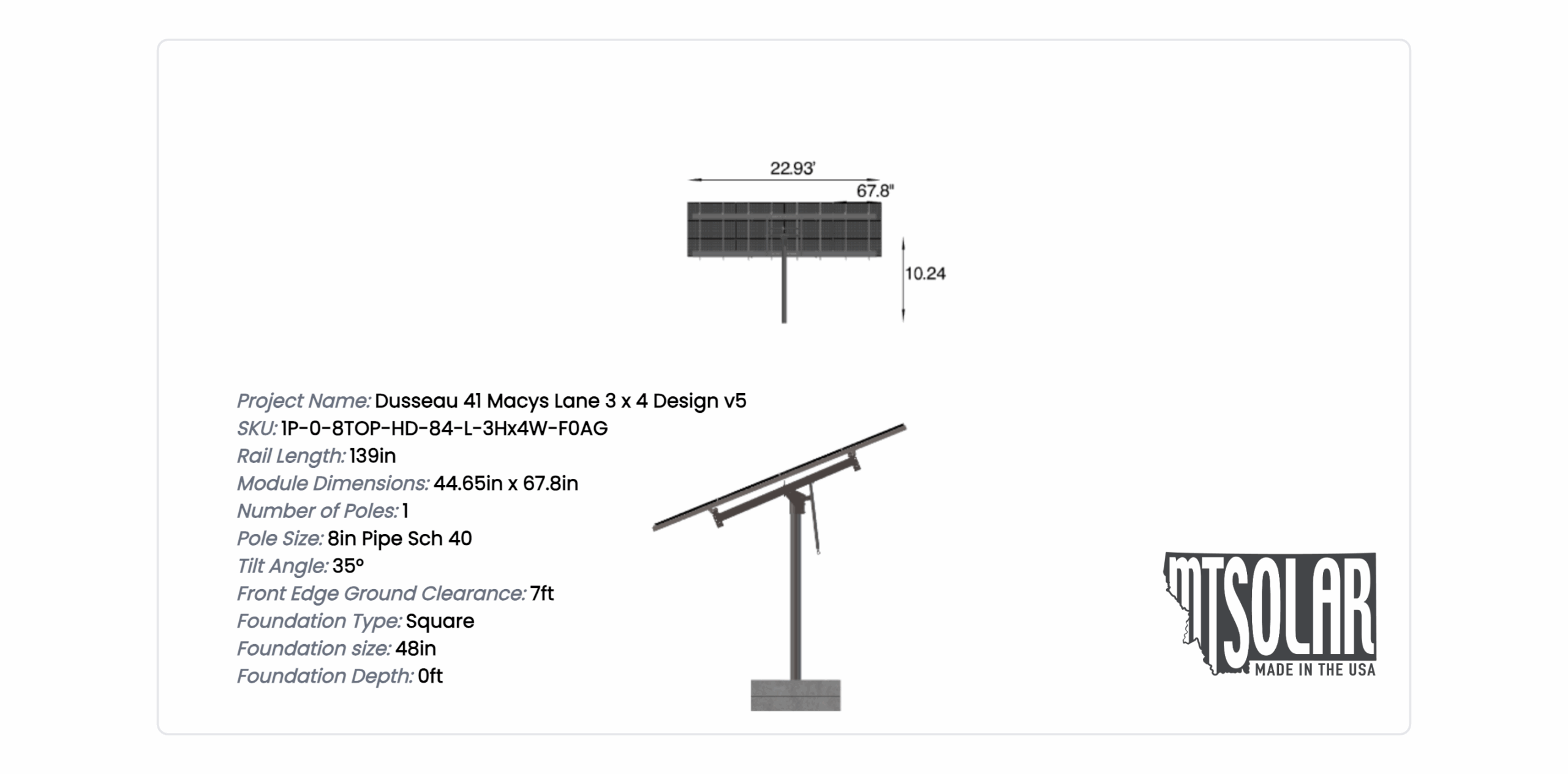This Pole Mount is designed to meet your site-specific inputs which are modules with dimensions of 67.8 inches by 44.65 inches and an array layout of 4 wide by 3 high.