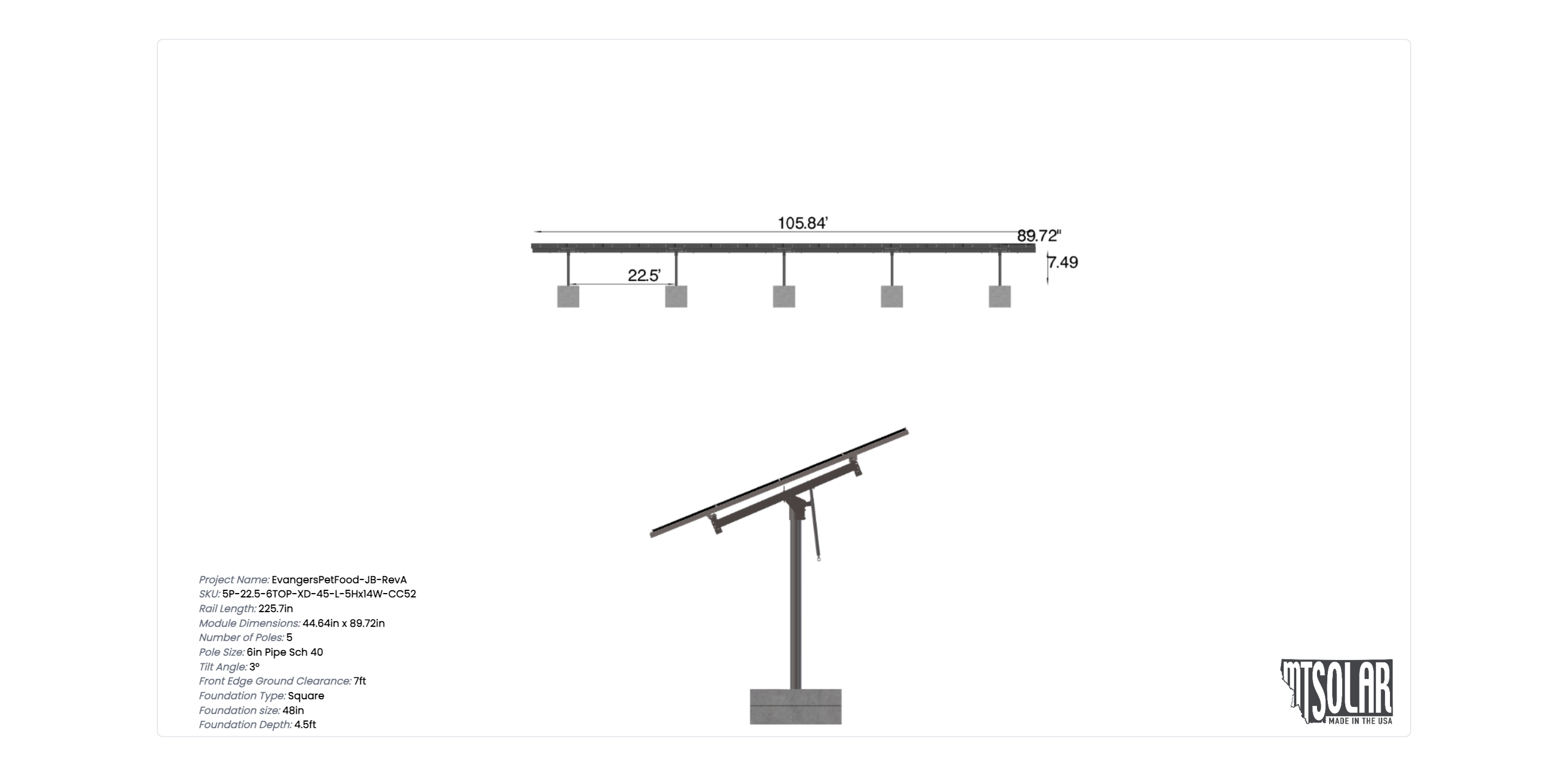 This Pole Mount is designed to meet your site-specific inputs which are modules with dimensions of 89.72 inches by 44.64 inches and an array layout of 14 wide by 5 high.
