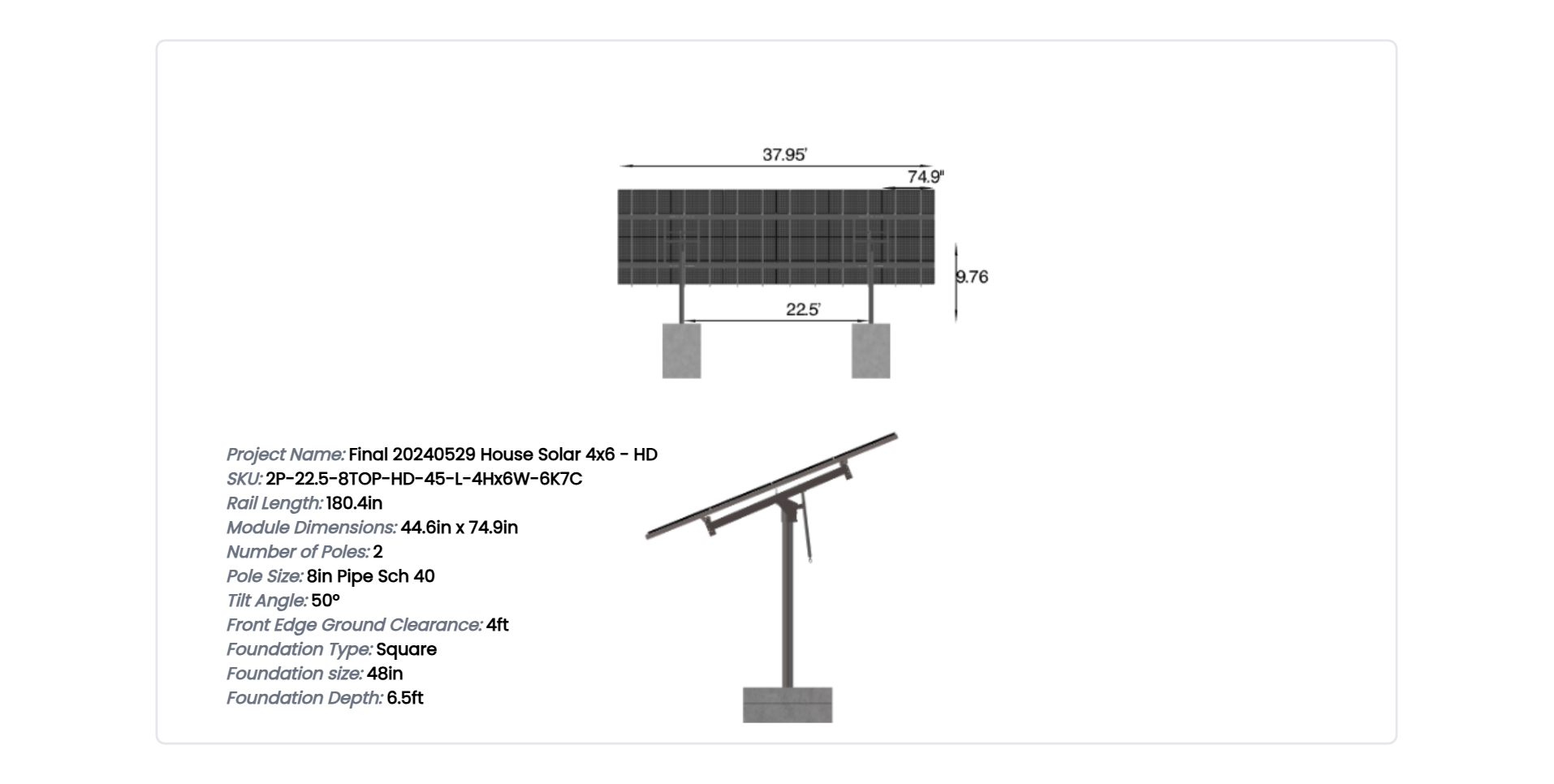 This Pole Mount is designed to meet your site-specific inputs which are modules with dimensions of 74.9 inches by 44.6 inches and an array layout of 6 wide by 4 high.