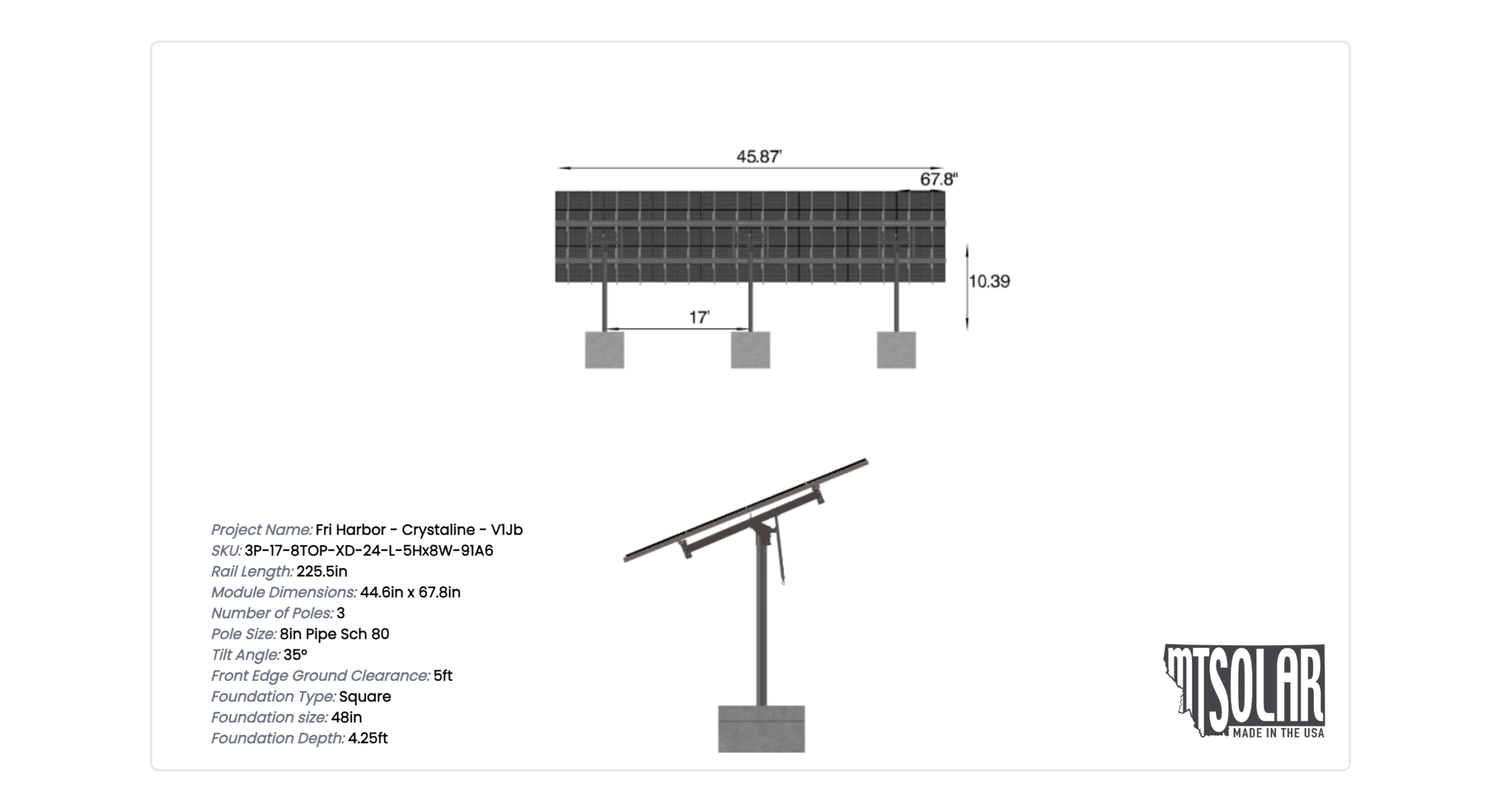 This Pole Mount is designed to meet your site-specific inputs which are modules with dimensions of 67.8 inches by 44.6 inches and an array layout of 8 wide by 5 high.