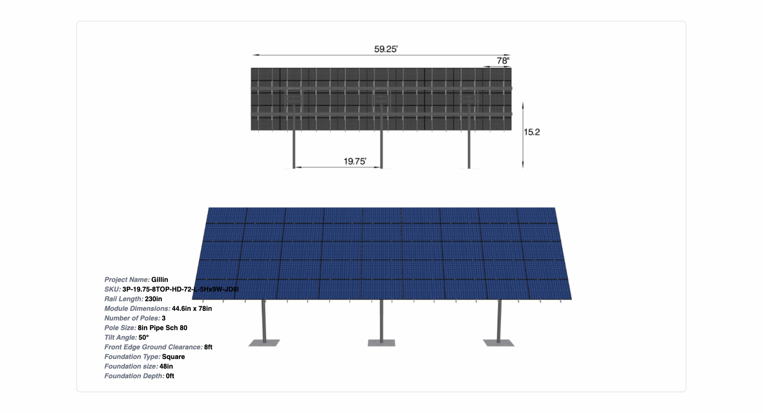 This Pole Mount is designed to meet your site-specific inputs which are modules with dimensions of 78 inches by 44.6 inches and an array layout of 9 wide by 5 high.