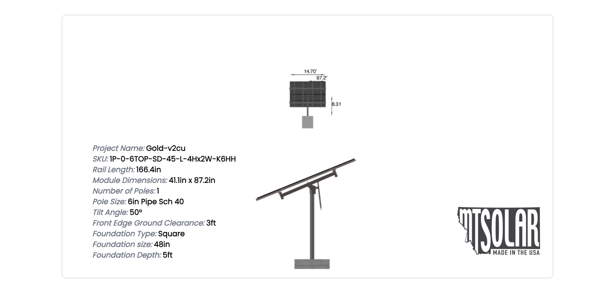 This Pole Mount is designed to meet your site-specific inputs which are modules with dimensions of 87.2 inches by 41.1 inches and an array layout of 2 wide by 4 high.