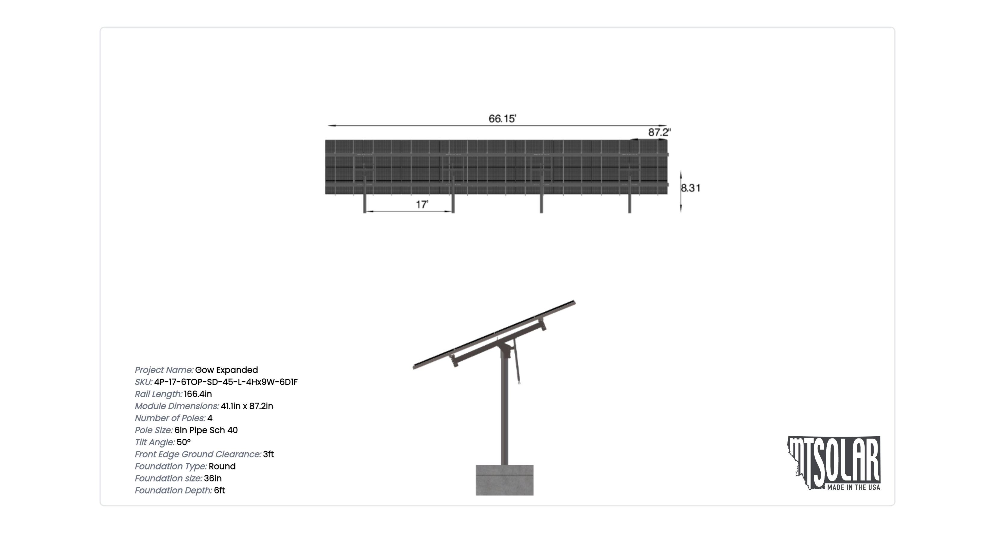 This Pole Mount is designed to meet your site-specific inputs which are modules with dimensions of 87.2 inches by 41.1 inches and an array layout of 9 wide by 4 high.