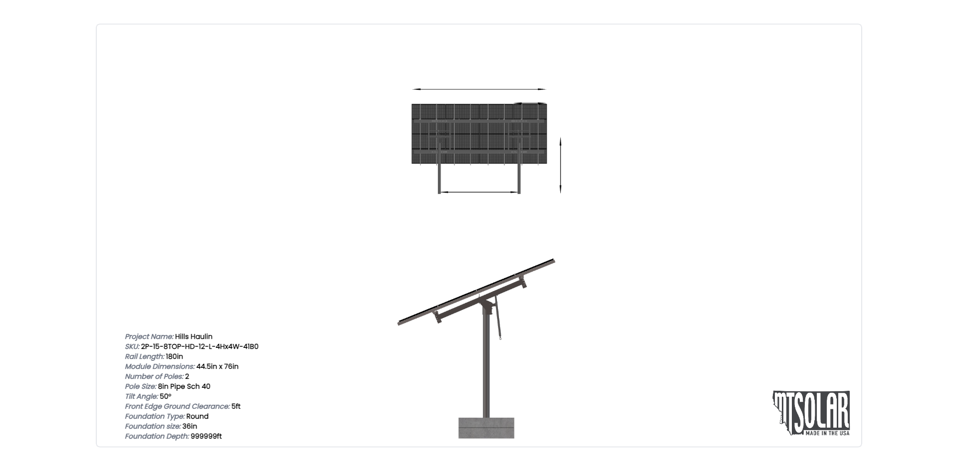 This Pole Mount is designed to meet your site-specific inputs which are modules with dimensions of 76 inches by 44.5 inches and an array layout of 4 wide by 4 high.