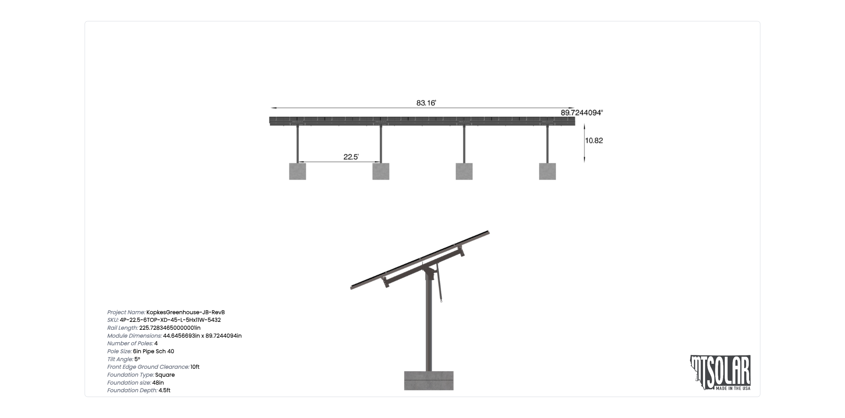 This Pole Mount is designed to meet your site-specific inputs which are modules with dimensions of 89.7244094 inches by 44.6456693 inches and an array layout of 11 wide by 5 high.