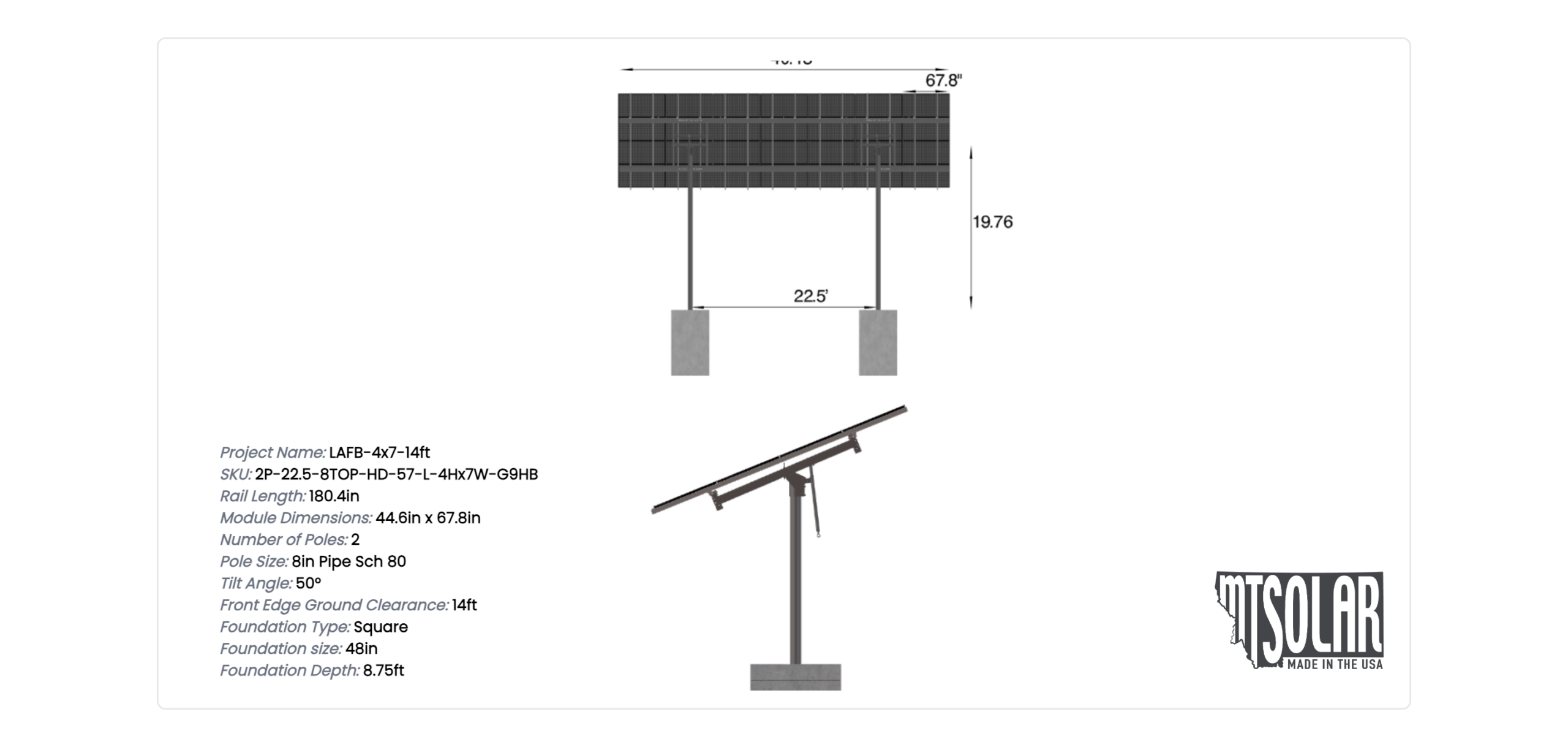 This Pole Mount is designed to meet your site-specific inputs which are modules with dimensions of 67.8 inches by 44.6 inches and an array layout of 7 wide by 4 high.