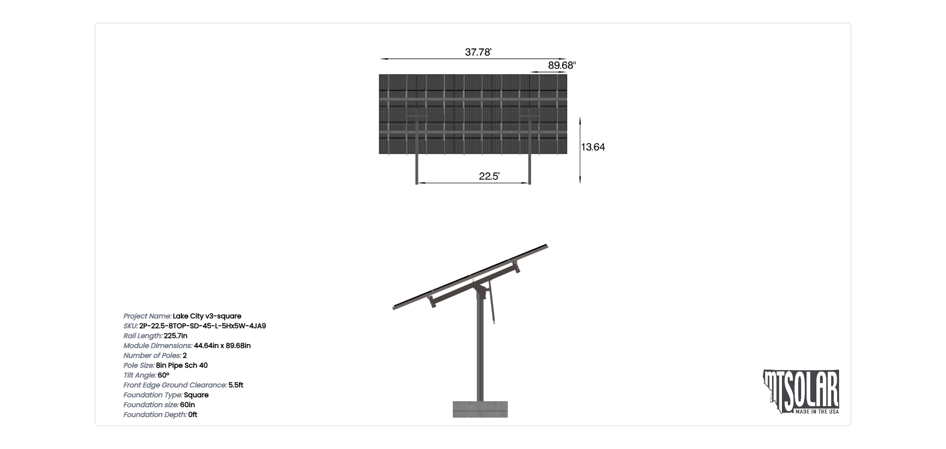 This Pole Mount is designed to meet your site-specific inputs which are modules with dimensions of 89.68 inches by 44.64 inches and an array layout of 5 wide by 5 high.