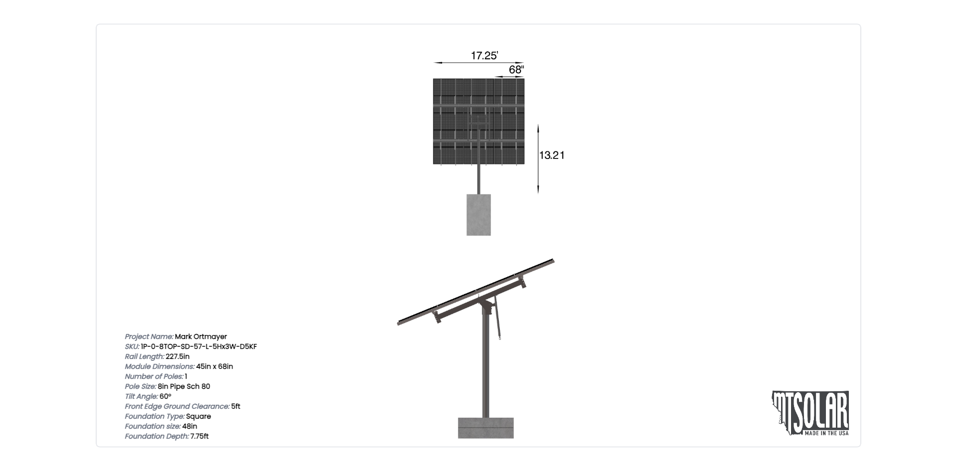 This Pole Mount is designed to meet your site-specific inputs which are modules with dimensions of 68 inches by 45 inches and an array layout of 3 wide by 5 high.