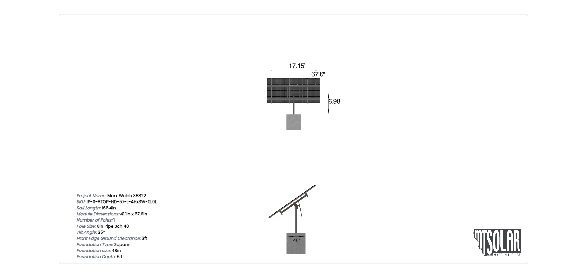 This Pole Mount is designed to meet your site-specific inputs which are modules with dimensions of 67.6 inches by 41.1 inches and an array layout of 3 wide by 4 high.