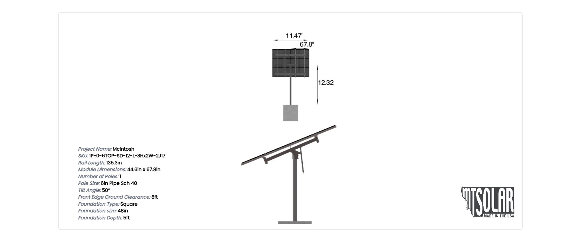 This Pole Mount is designed to meet your site-specific inputs which are modules with dimensions of 67.8 inches by 44.6 inches and an array layout of 2 wide by 3 high.