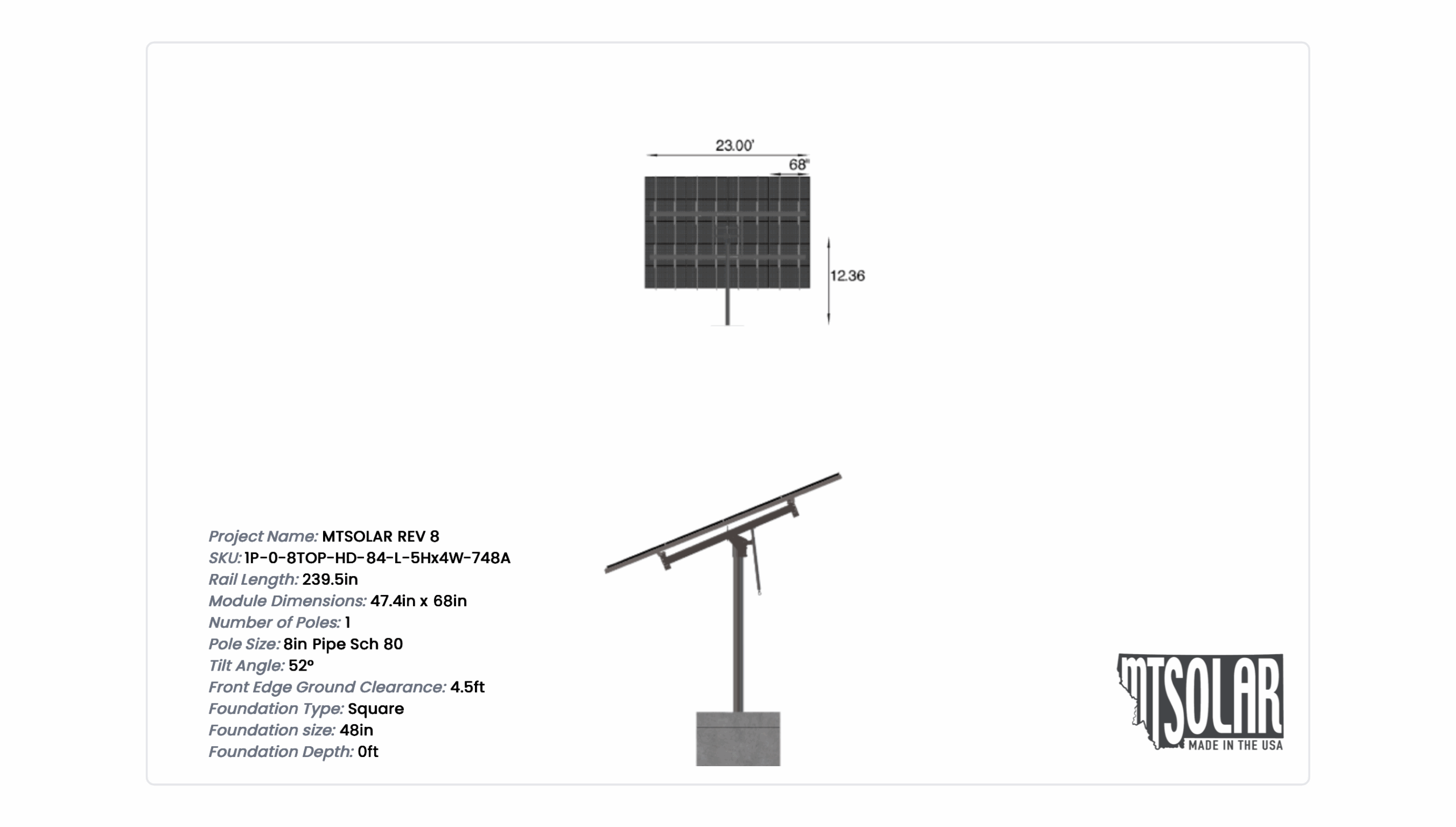 This Pole Mount is designed to meet your site-specific inputs which are modules with dimensions of 68 inches by 47.4 inches and an array layout of 4 wide by 5 high.
