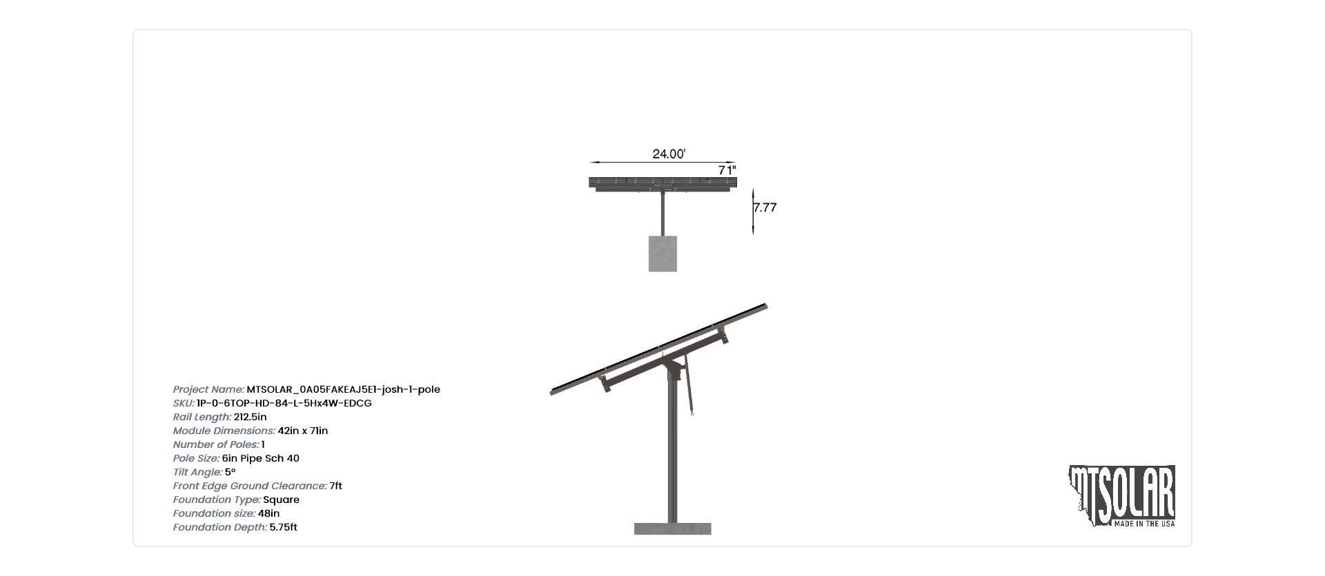 This Pole Mount is designed to meet your site-specific inputs which are modules with dimensions of 71 inches by 42 inches and an array layout of 4 wide by 5 high.