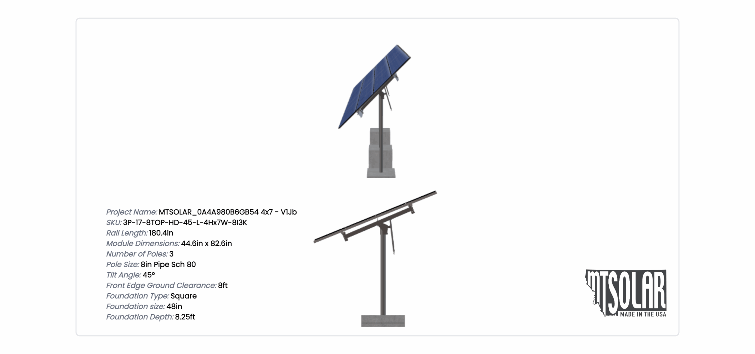 This Pole Mount is designed to meet your site-specific inputs which are modules with dimensions of 82.6 inches by 44.6 inches and an array layout of 7 wide by 4 high.