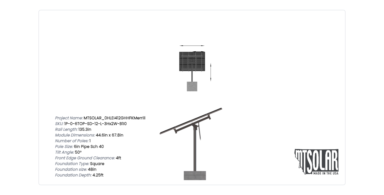 This Pole Mount is designed to meet your site-specific inputs which are modules with dimensions of 67.8 inches by 44.6 inches and an array layout of 2 wide by 3 high.