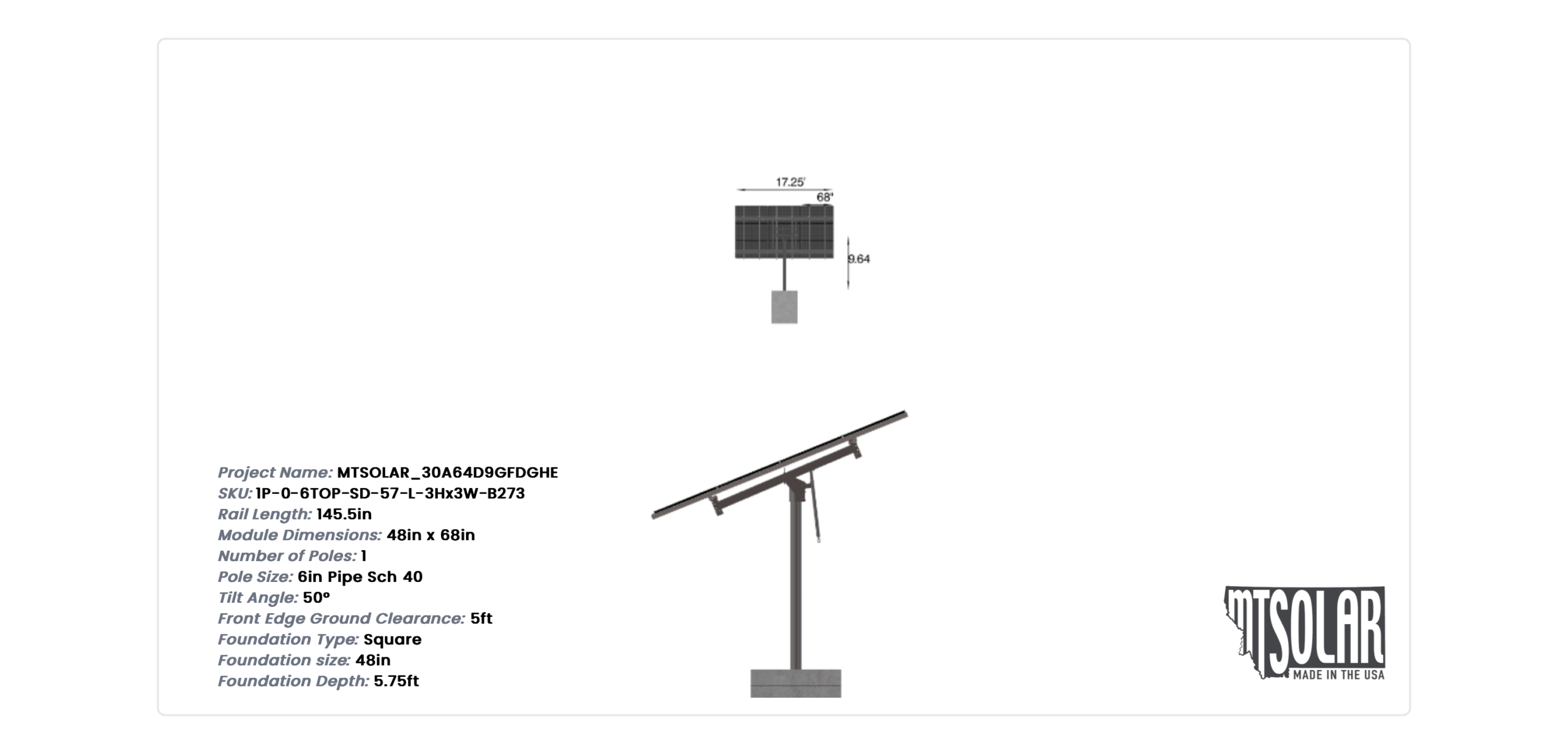 This Pole Mount is designed to meet your site-specific inputs which are modules with dimensions of 68 inches by 48 inches and an array layout of 3 wide by 3 high.
