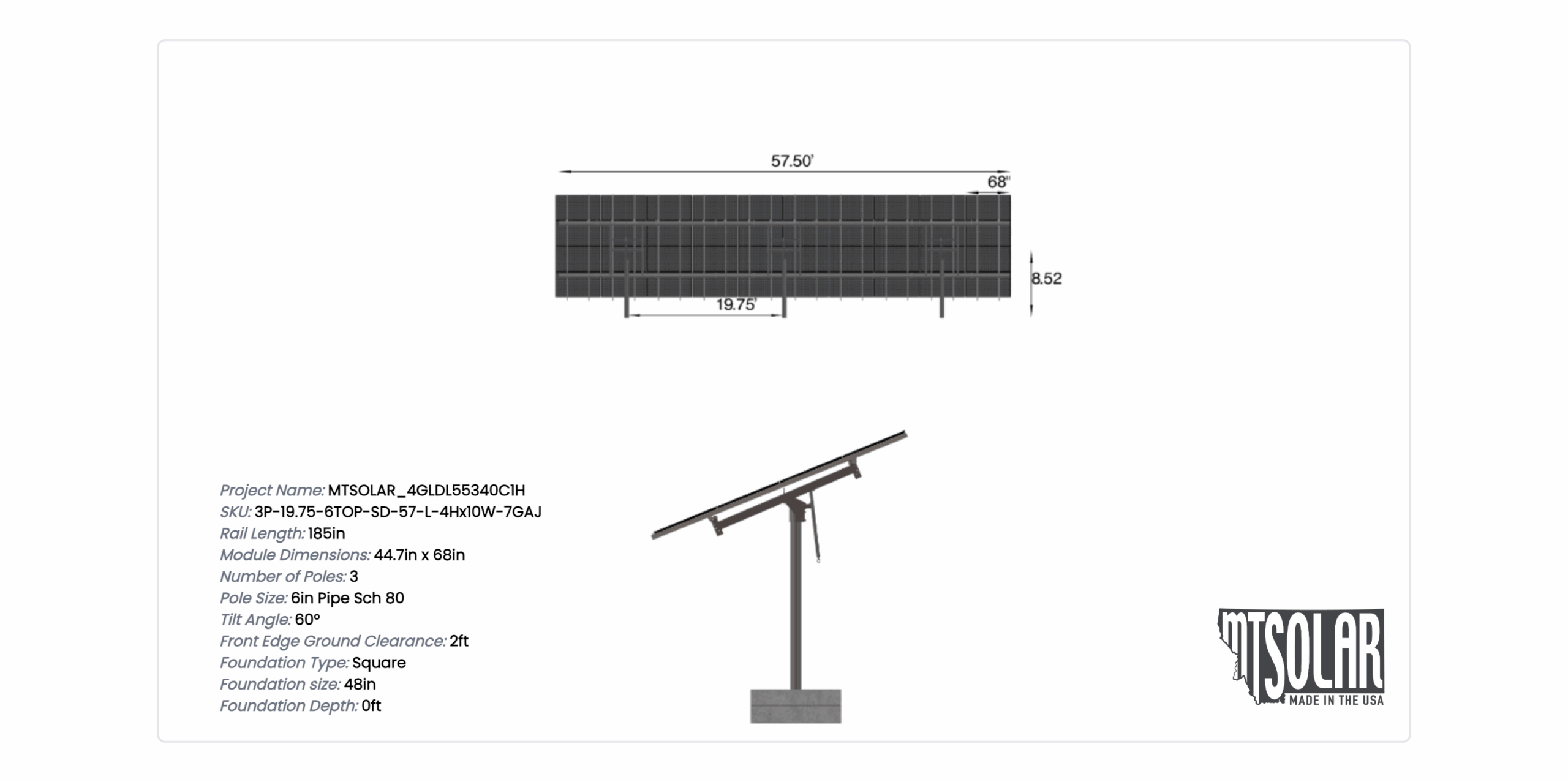 This Pole Mount is designed to meet your site-specific inputs which are modules with dimensions of 68 inches by 44.7 inches and an array layout of 10 wide by 4 high.