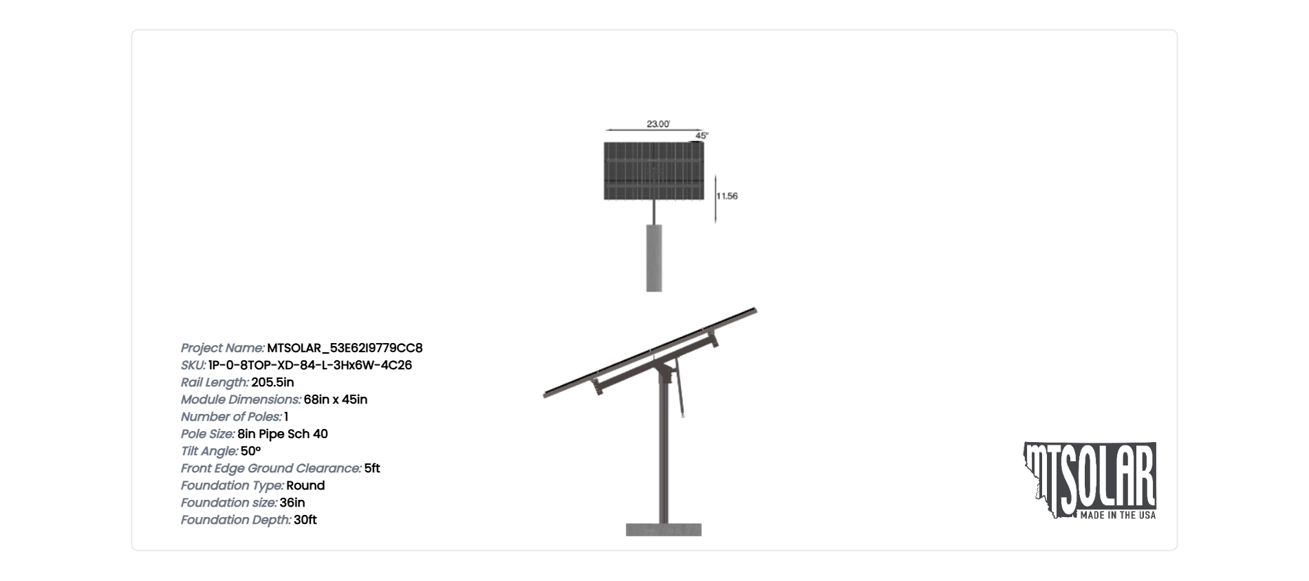 This Pole Mount is designed to meet your site-specific inputs which are modules with dimensions of 45 inches by 68 inches and an array layout of 6 wide by 3 high.