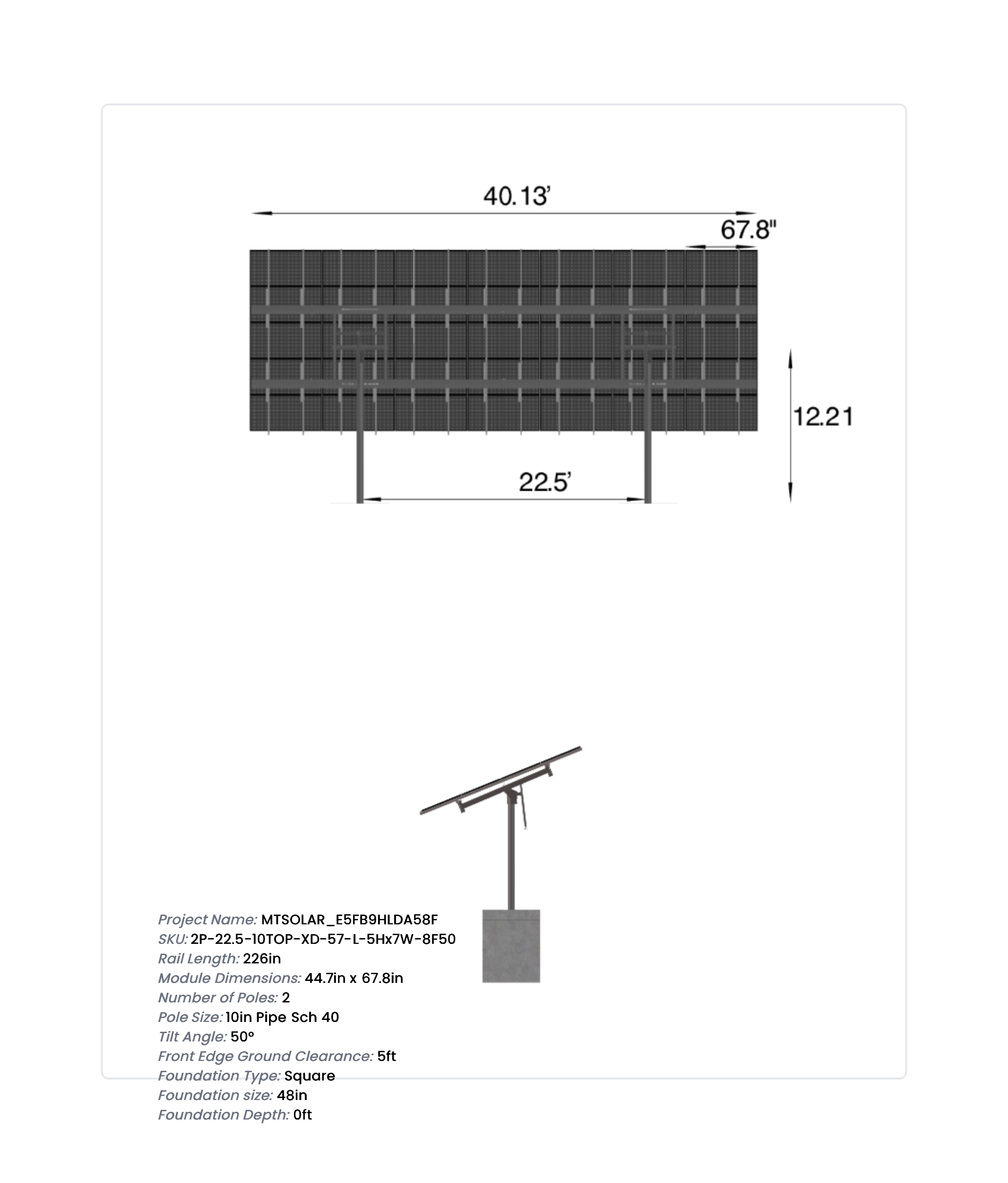 This Pole Mount is designed to meet your site-specific inputs which are modules with dimensions of 67.8 inches by 44.7 inches and an array layout of 7 wide by 5 high.