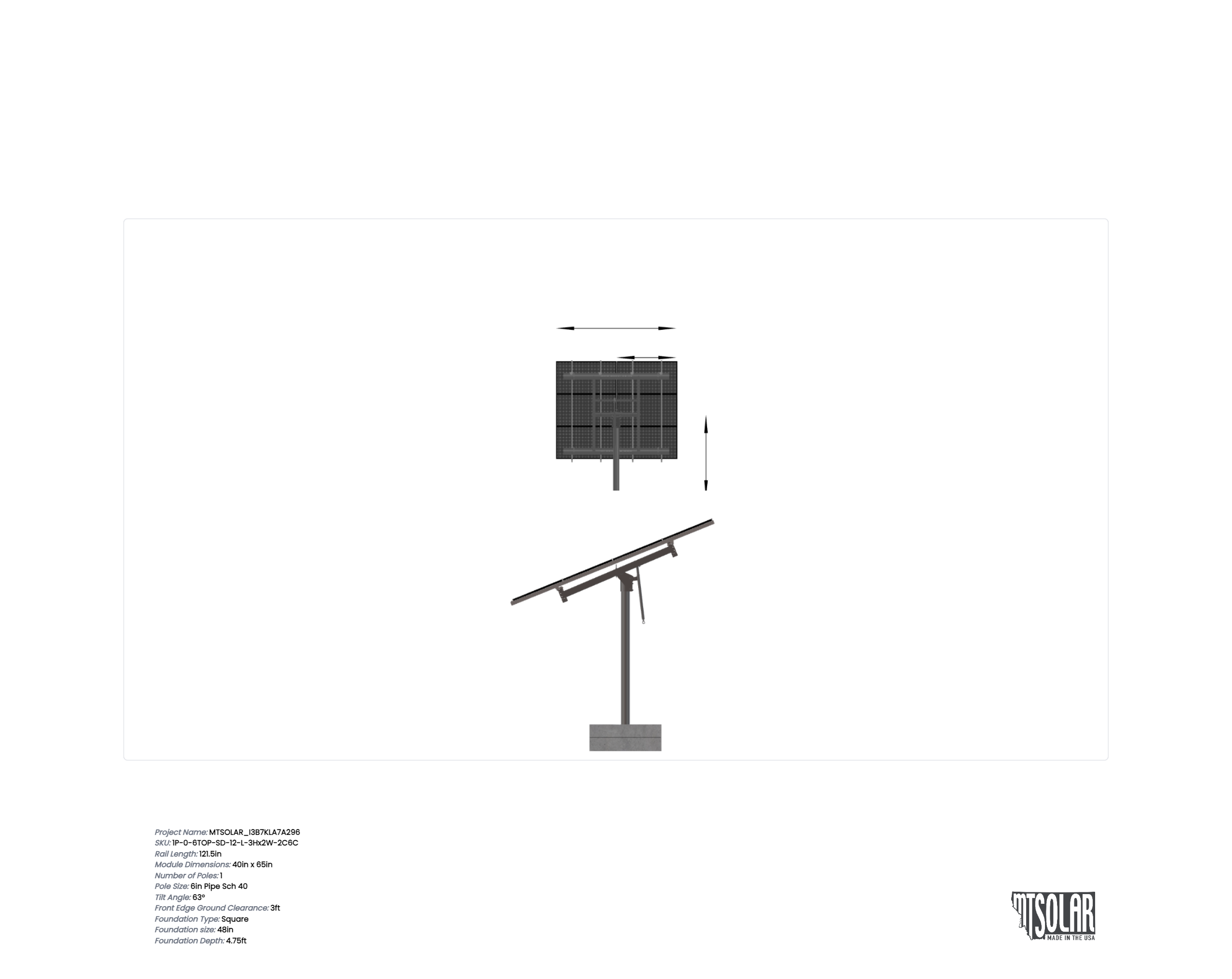 This Pole Mount is designed to meet your site-specific inputs which are modules with dimensions of 65 inches by 40 inches and an array layout of 2 wide by 3 high.