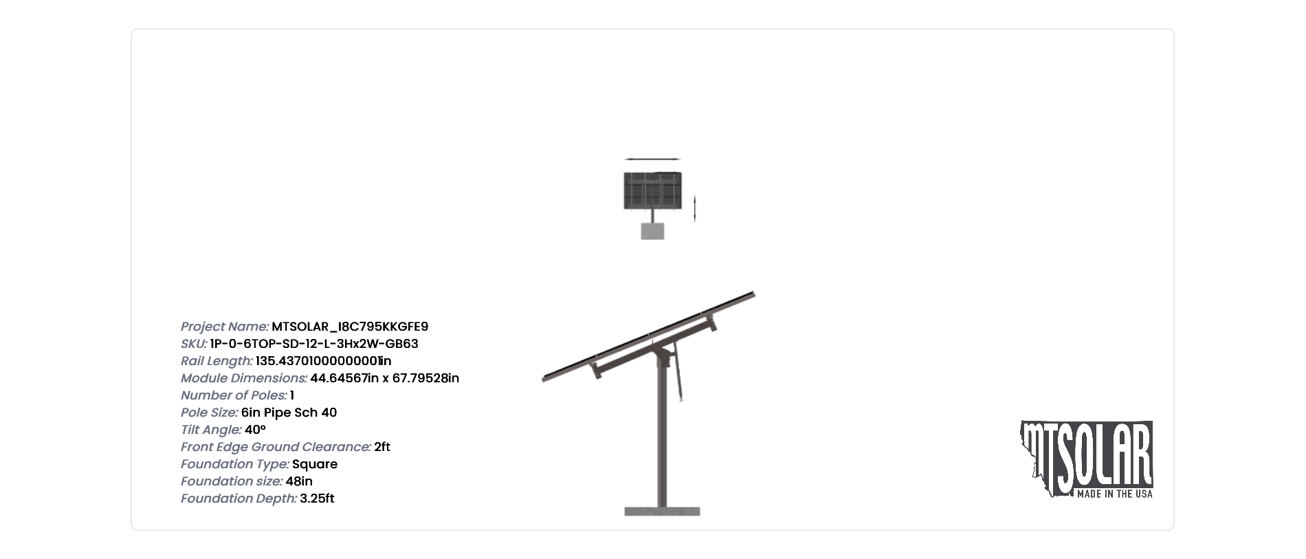 This Pole Mount is designed to meet your site-specific inputs which are modules with dimensions of 67.79528 inches by 44.64567 inches and an array layout of 2 wide by 3 high.