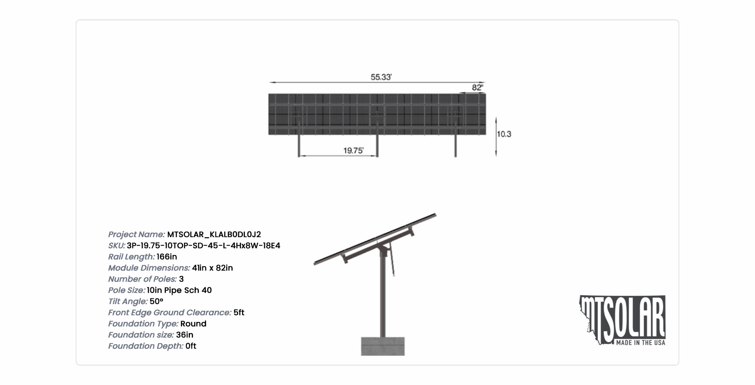 This Pole Mount is designed to meet your site-specific inputs which are modules with dimensions of 82 inches by 41 inches and an array layout of 8 wide by 4 high.