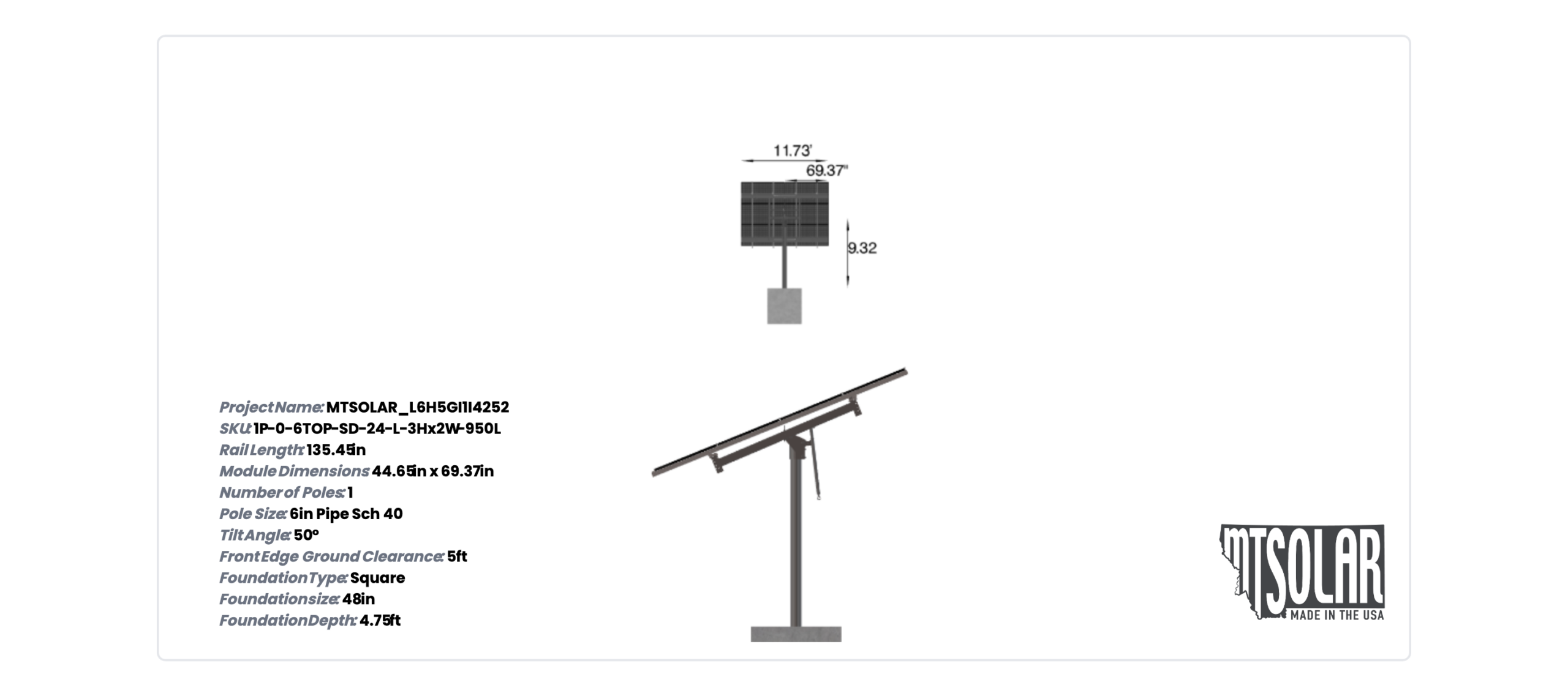 This Pole Mount is designed to meet your site-specific inputs which are modules with dimensions of 69.37 inches by 44.65 inches and an array layout of 2 wide by 3 high.