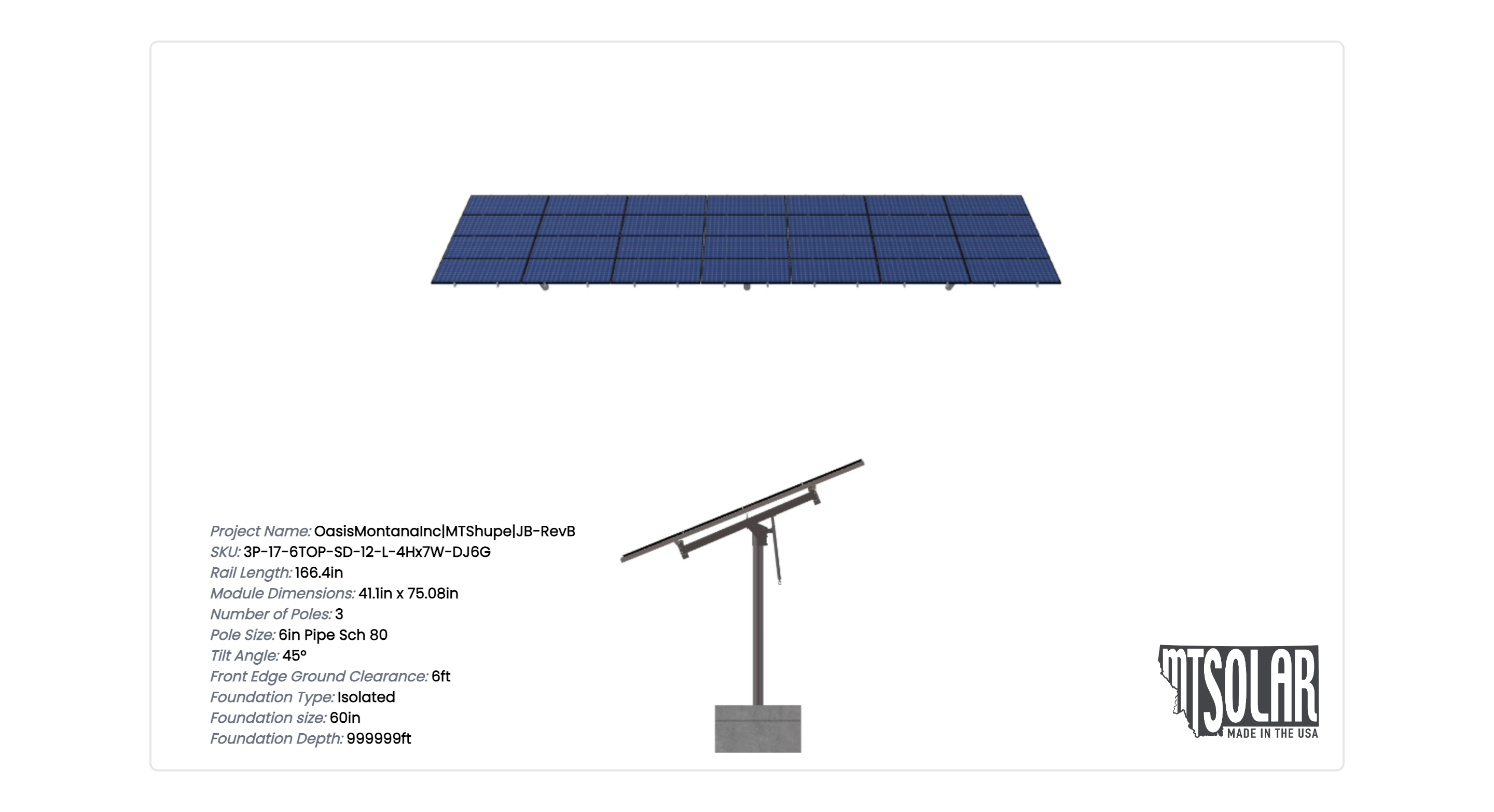 This Pole Mount is designed to meet your site-specific inputs which are modules with dimensions of 75.08 inches by 41.1 inches and an array layout of 7 wide by 4 high.