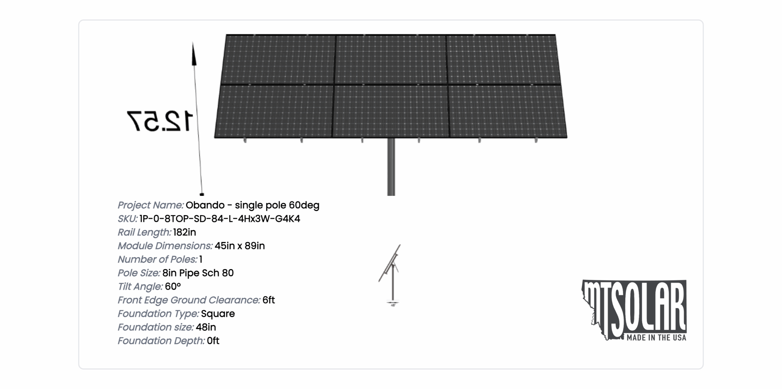 This Pole Mount is designed to meet your site-specific inputs which are modules with dimensions of 89 inches by 45 inches and an array layout of 3 wide by 4 high.