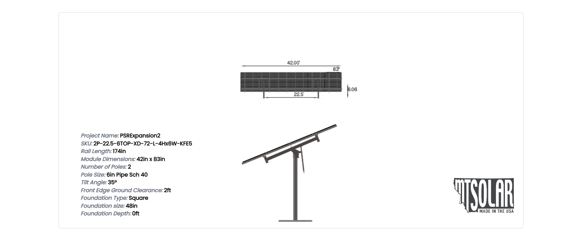 This Pole Mount is designed to meet your site-specific inputs which are modules with dimensions of 83 inches by 42 inches and an array layout of 6 wide by 4 high.