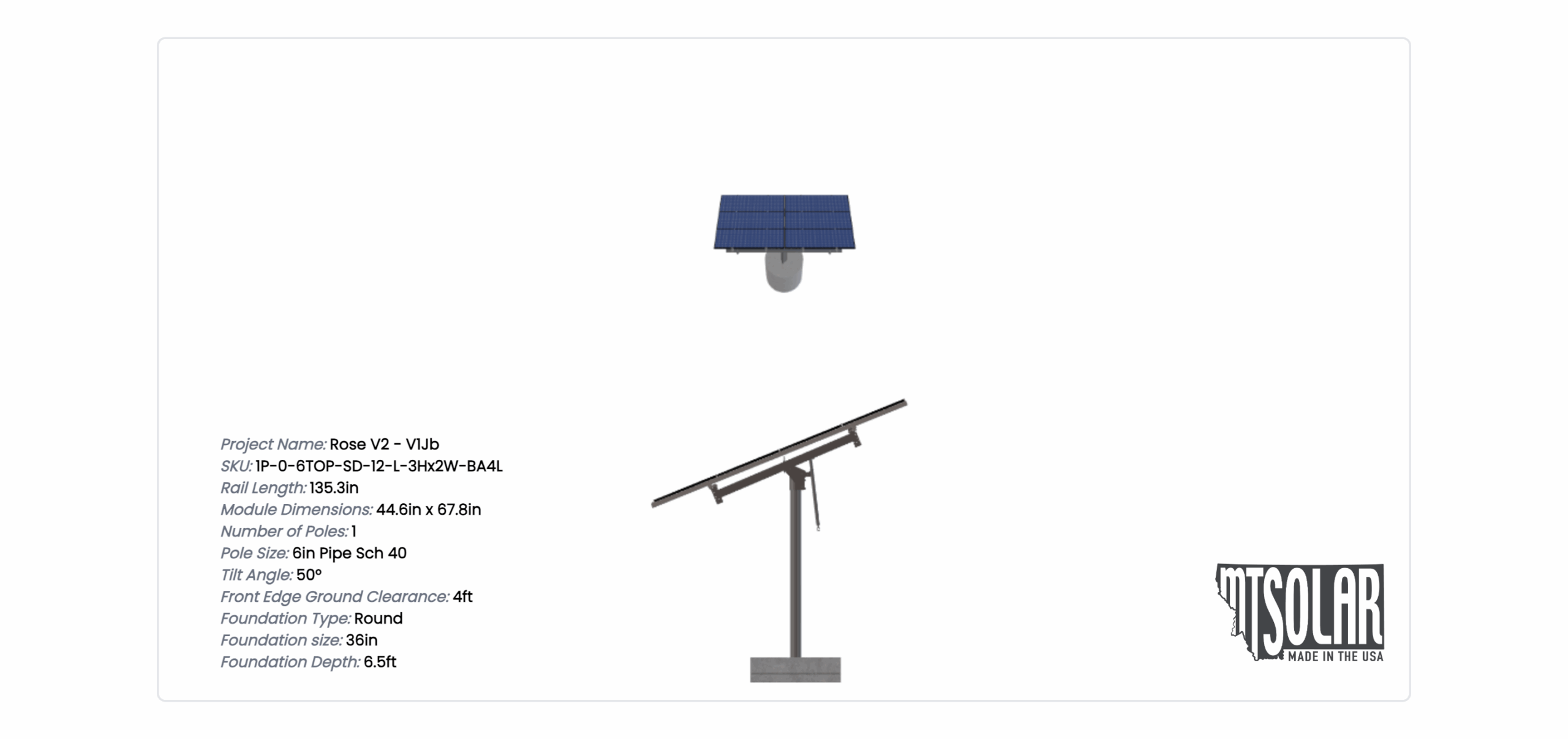 This Pole Mount is designed to meet your site-specific inputs which are modules with dimensions of 67.8 inches by 44.6 inches and an array layout of 2 wide by 3 high.