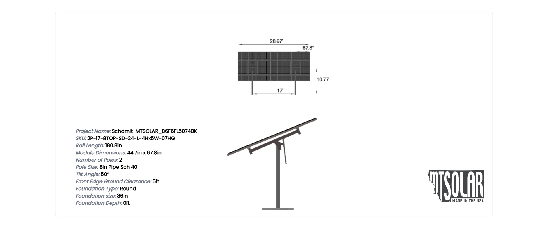 This Pole Mount is designed to meet your site-specific inputs which are modules with dimensions of 67.8 inches by 44.7 inches and an array layout of 5 wide by 4 high.