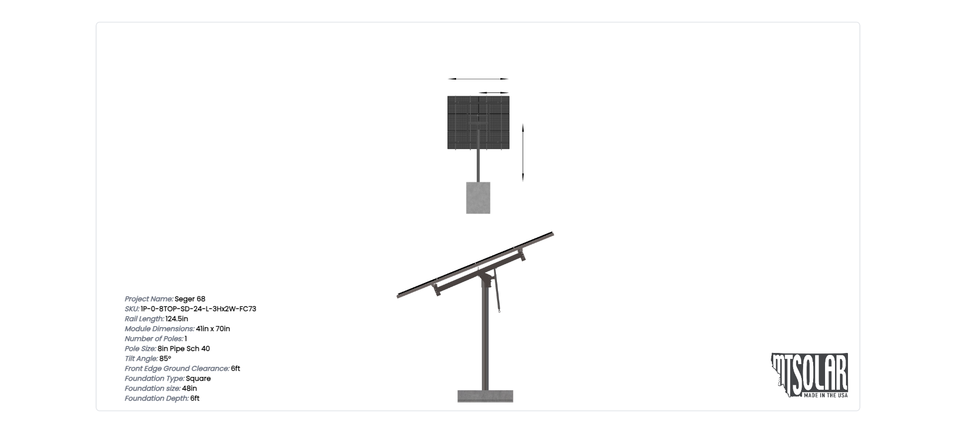 This Pole Mount is designed to meet your site-specific inputs which are modules with dimensions of 70 inches by 41 inches and an array layout of 2 wide by 3 high.
