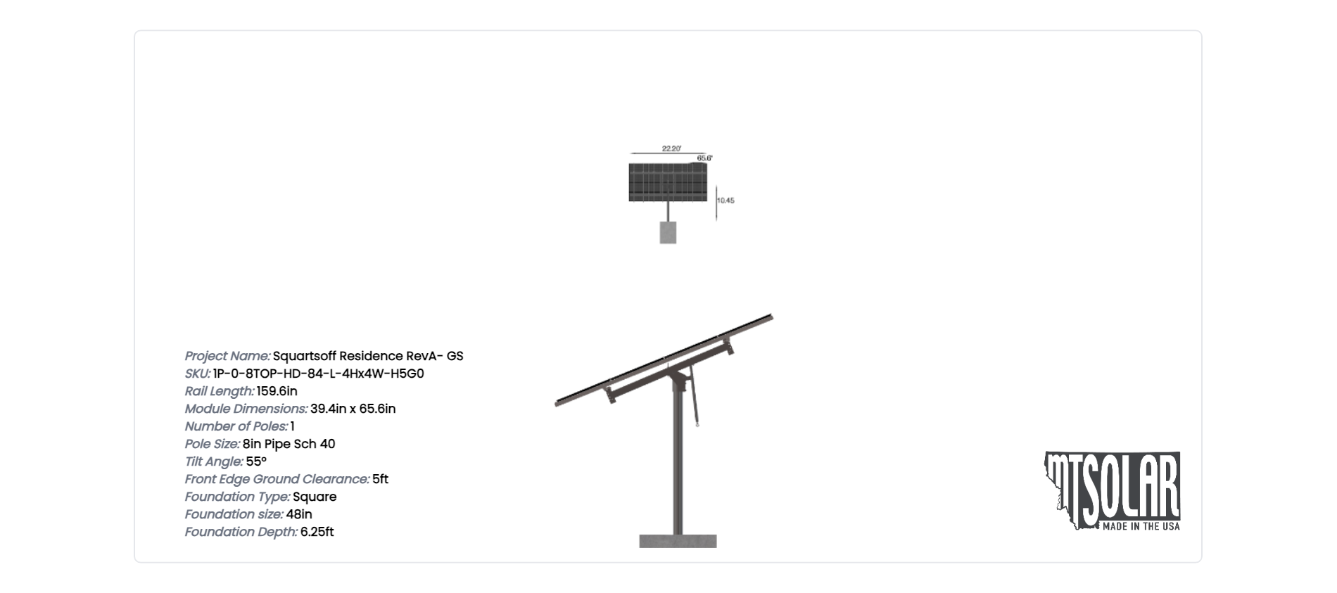 This Pole Mount is designed to meet your site-specific inputs which are modules with dimensions of 65.6 inches by 39.4 inches and an array layout of 4 wide by 4 high.