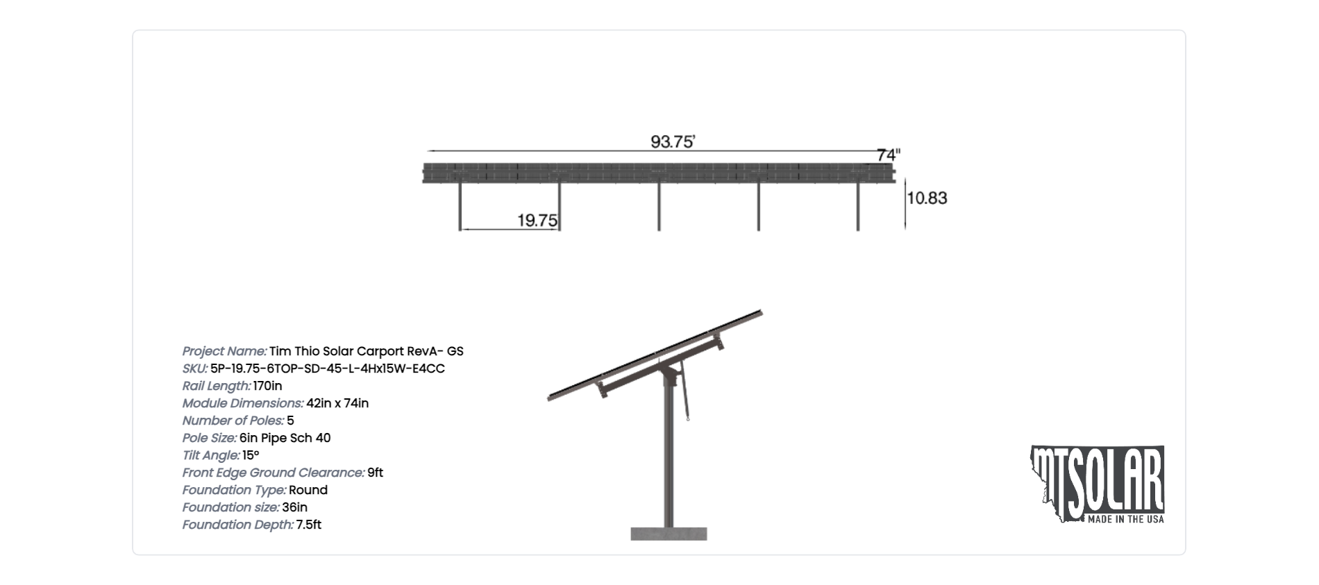 This Pole Mount is designed to meet your site-specific inputs which are modules with dimensions of 74 inches by 42 inches and an array layout of 15 wide by 4 high.