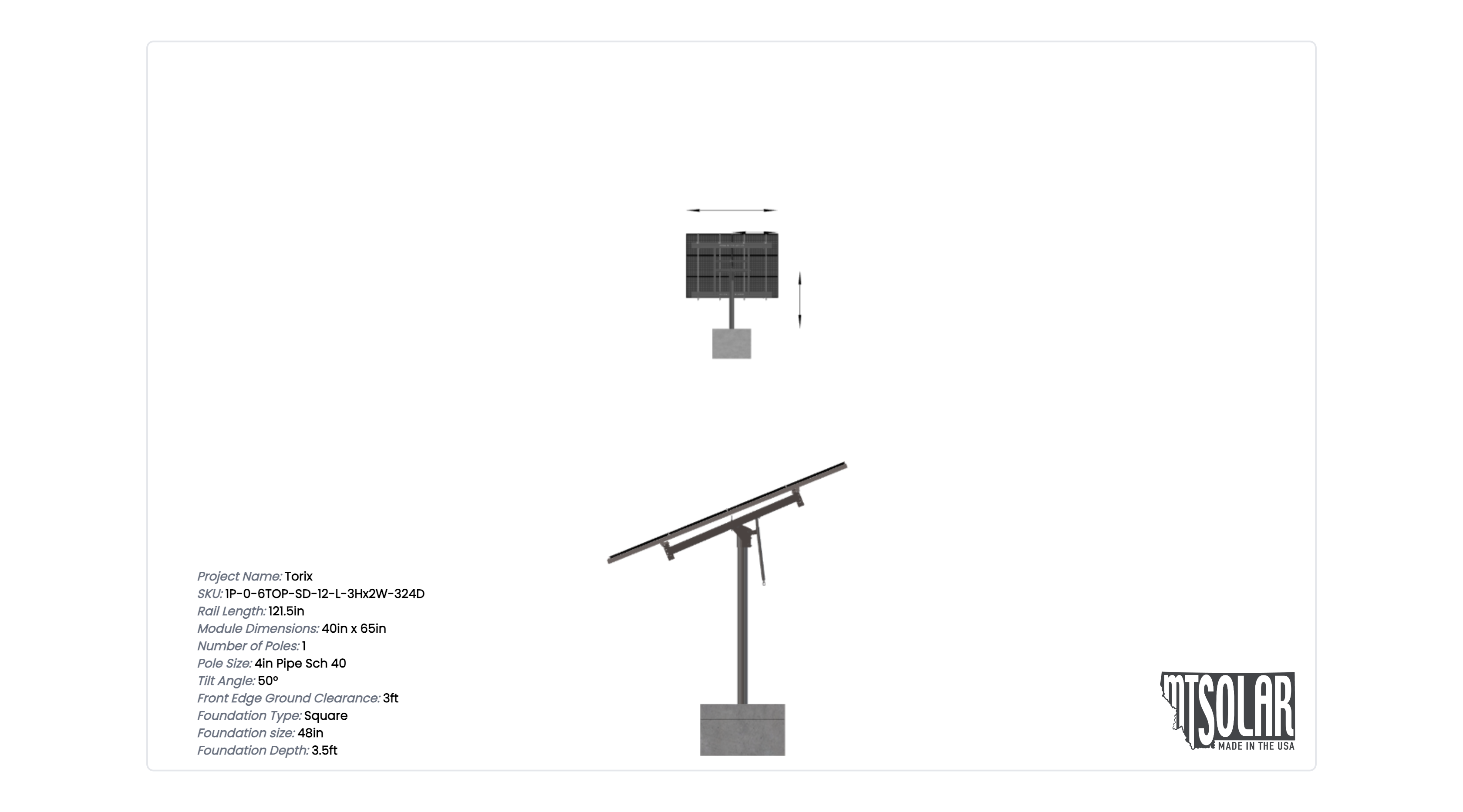 This Pole Mount is designed to meet your site-specific inputs which are modules with dimensions of 65 inches by 40 inches and an array layout of 2 wide by 3 high.